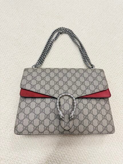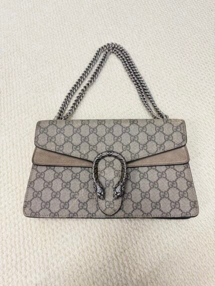 Gucci Dionysus GG Supreme帆布单肩包(大号) 100% 完全认证。 这款包袋采用做旧GG帆布制成,饰以浅棕色麂皮滚边,并配有标志性的双虎头金属搭扣(做旧银色饰面)。粗链条肩带可肩背或斜挎,轻松收纳手机、钱包等日常必需品。做旧风格散发着复古气息,适合复古风、休闲风等多种穿搭场合。 状况良好,与做旧设计的纹理方向一致。