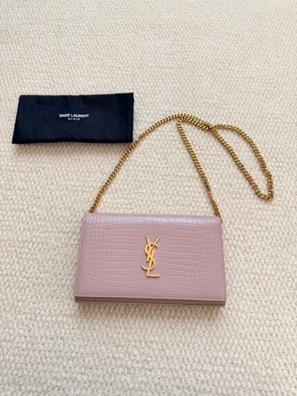 Saint Laurent Kate Wallet on Chain (WOC) in Pale Pink Crocodile-Embossed Leather