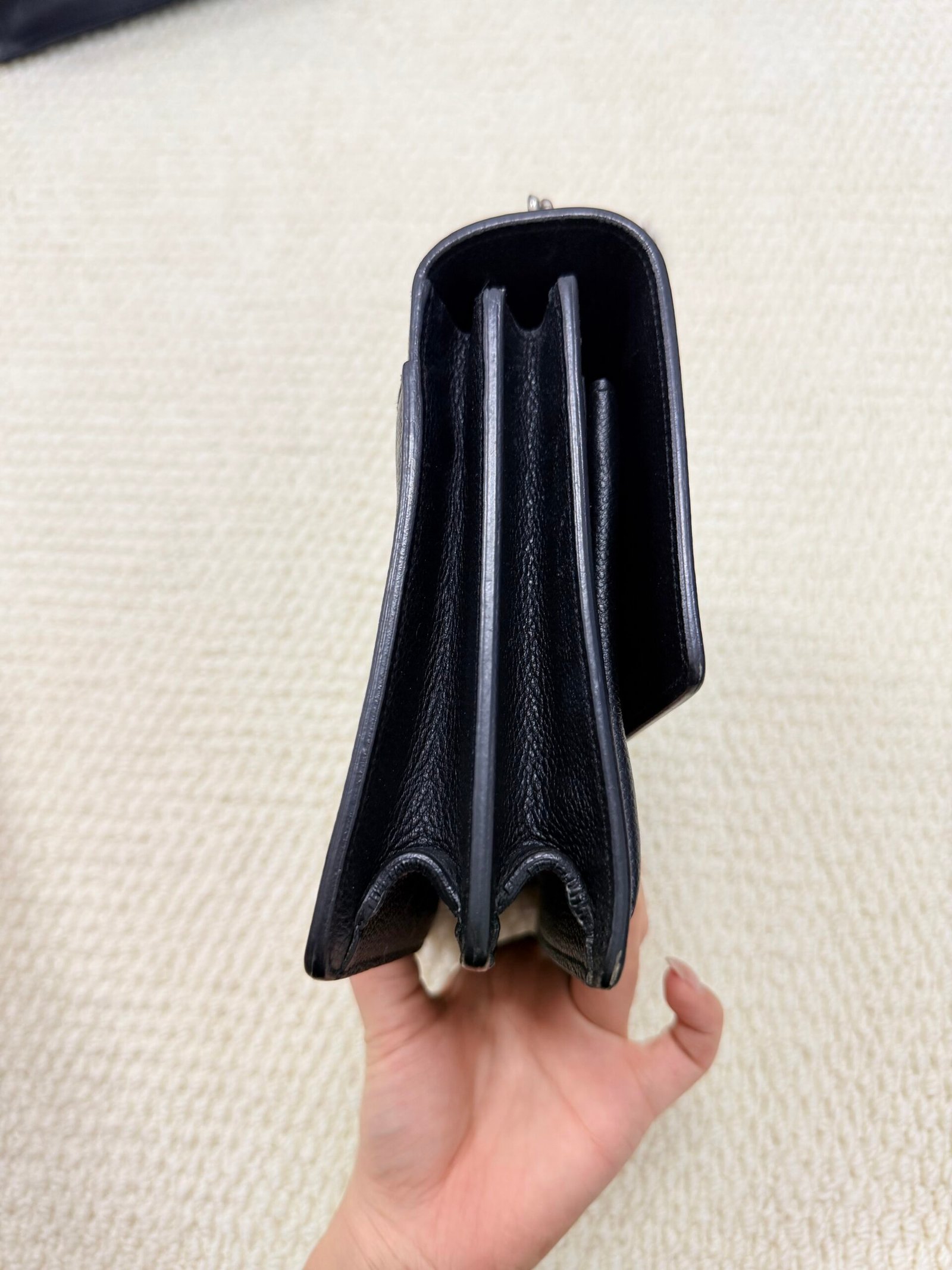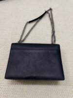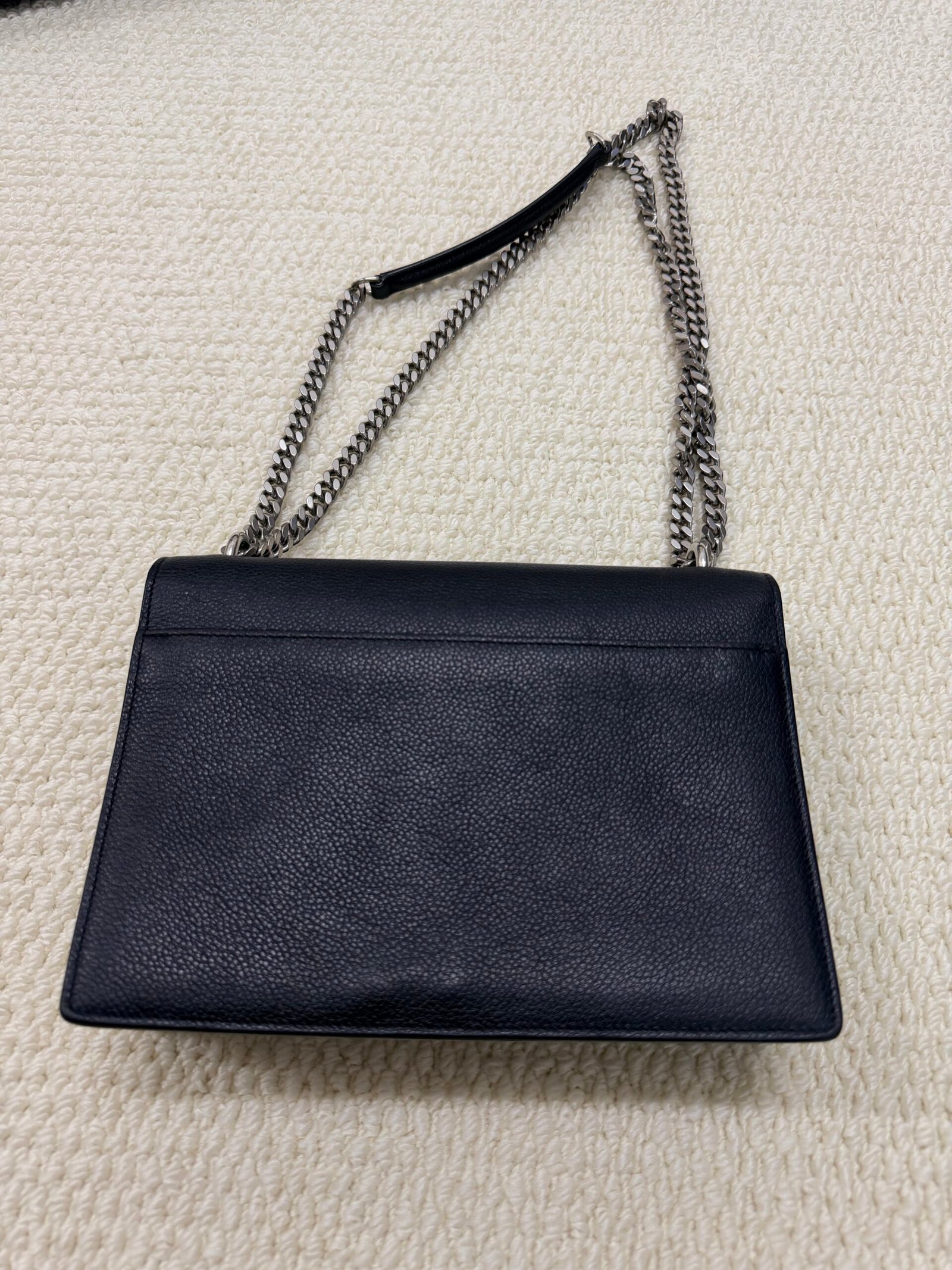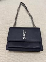 Crafted from durable black grained calfskin leather, this iconic Sunset bag features the signature silver-tone YSL monogram plaque at the center, paired with a convertible chain-and-leather shoulder strap that can be worn on the shoulder, crossbody, or doubled for a shorter look. The structured flap design opens to a spacious interior with multiple card slots and a slip pocket, blending timeless elegance with everyday functionality.