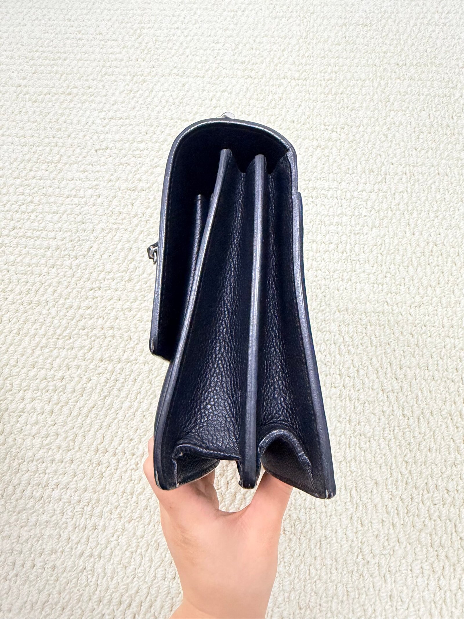 Great pre-owned condition — minor light wear on the chain strap and hardware, with the grained leather intact and the silver-tone finish still vibrant.