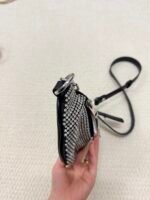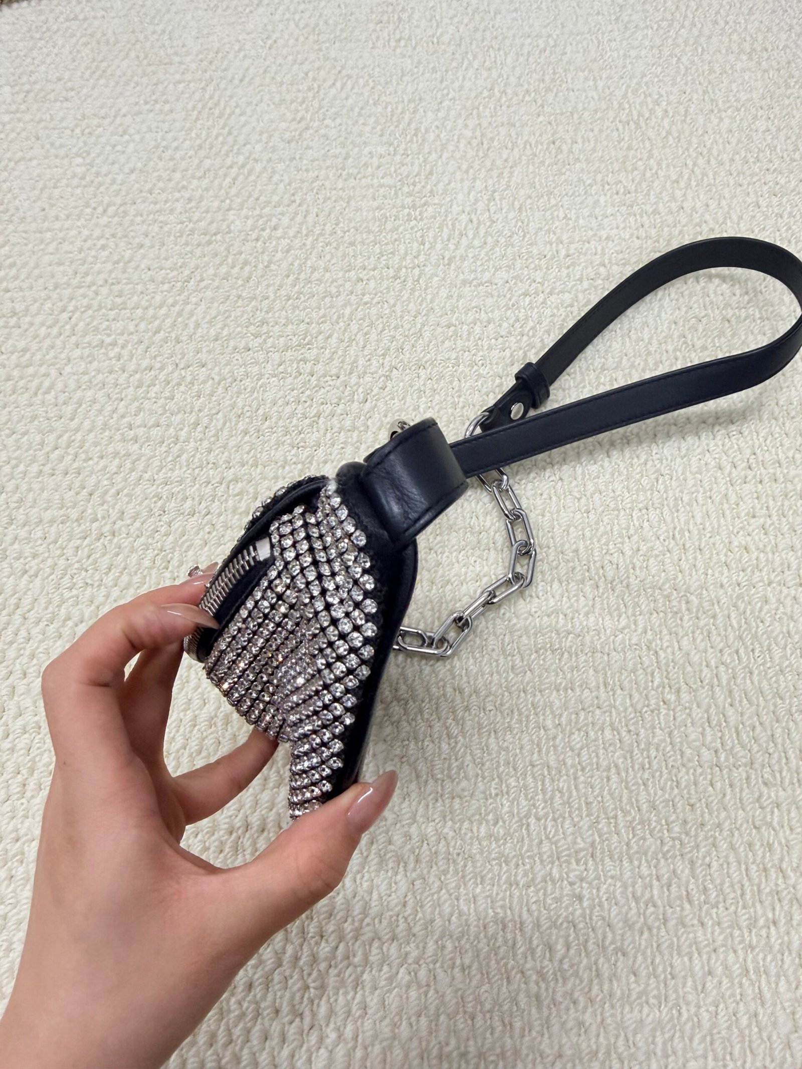 这款包采用黑色皮革精制而成,饰以璀璨水晶,并配有链条皮革肩带(黑色皮革+银色金属链条)。它可作为腰包、单肩包或斜挎包使用——小巧时尚,可轻松收纳卡片、手机等必备小物,是派对和日常穿搭的理想之选。