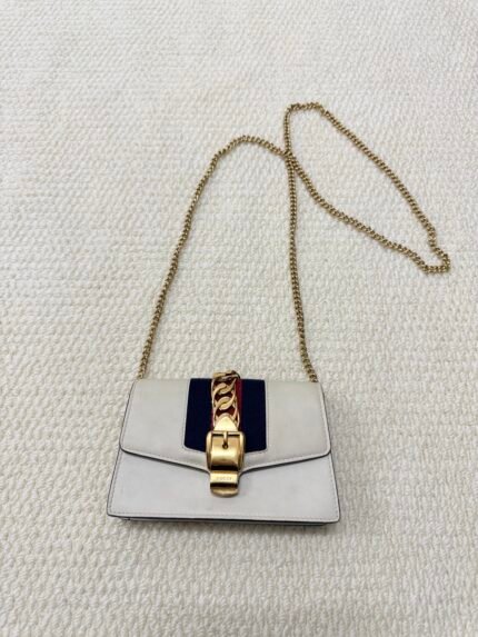 Great pre-owned condition — minor light scuffs on the leather edges, with the intricate weave intact and the deep navy color still vibrant.