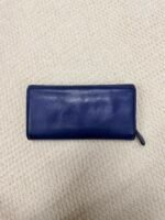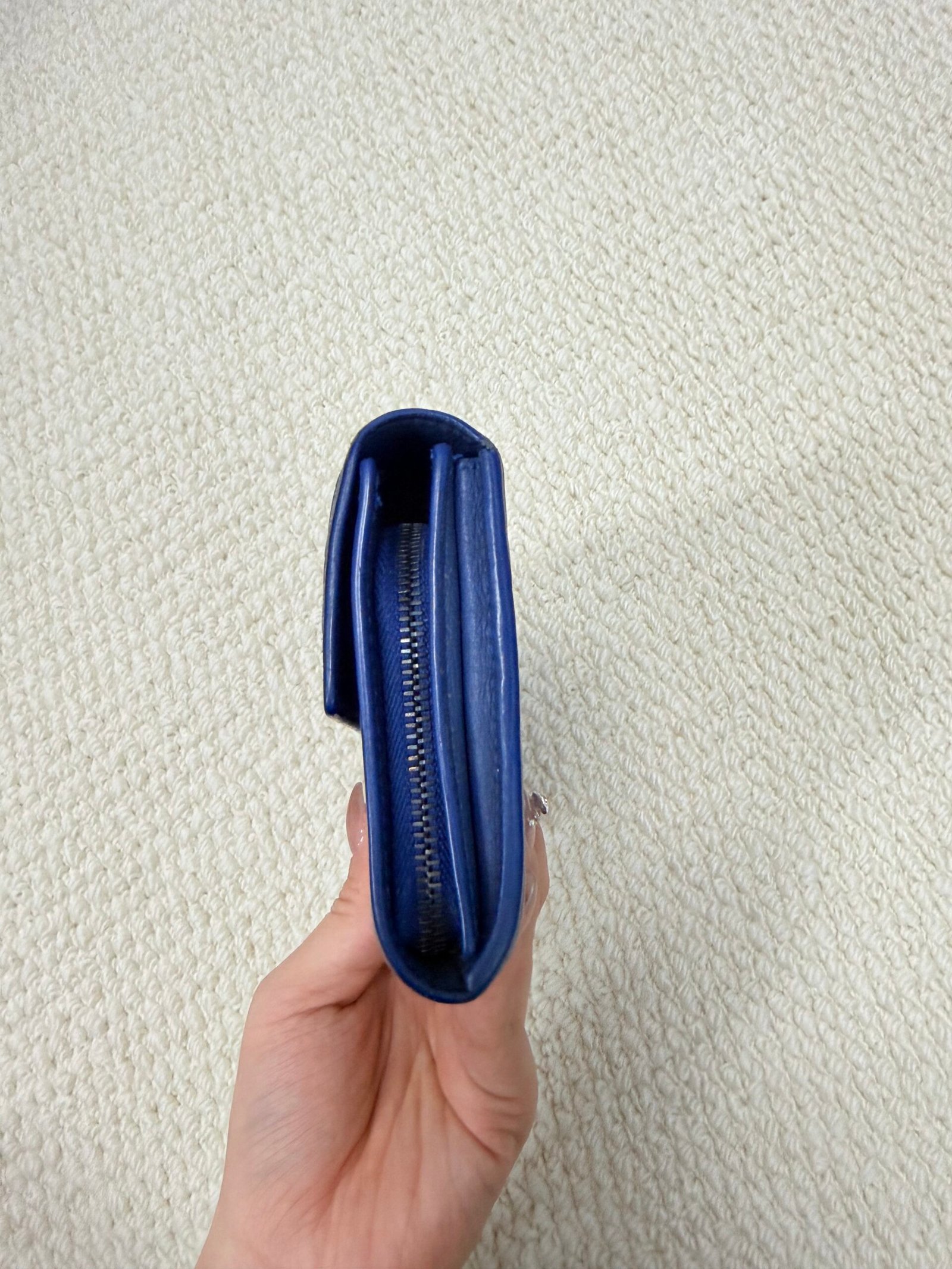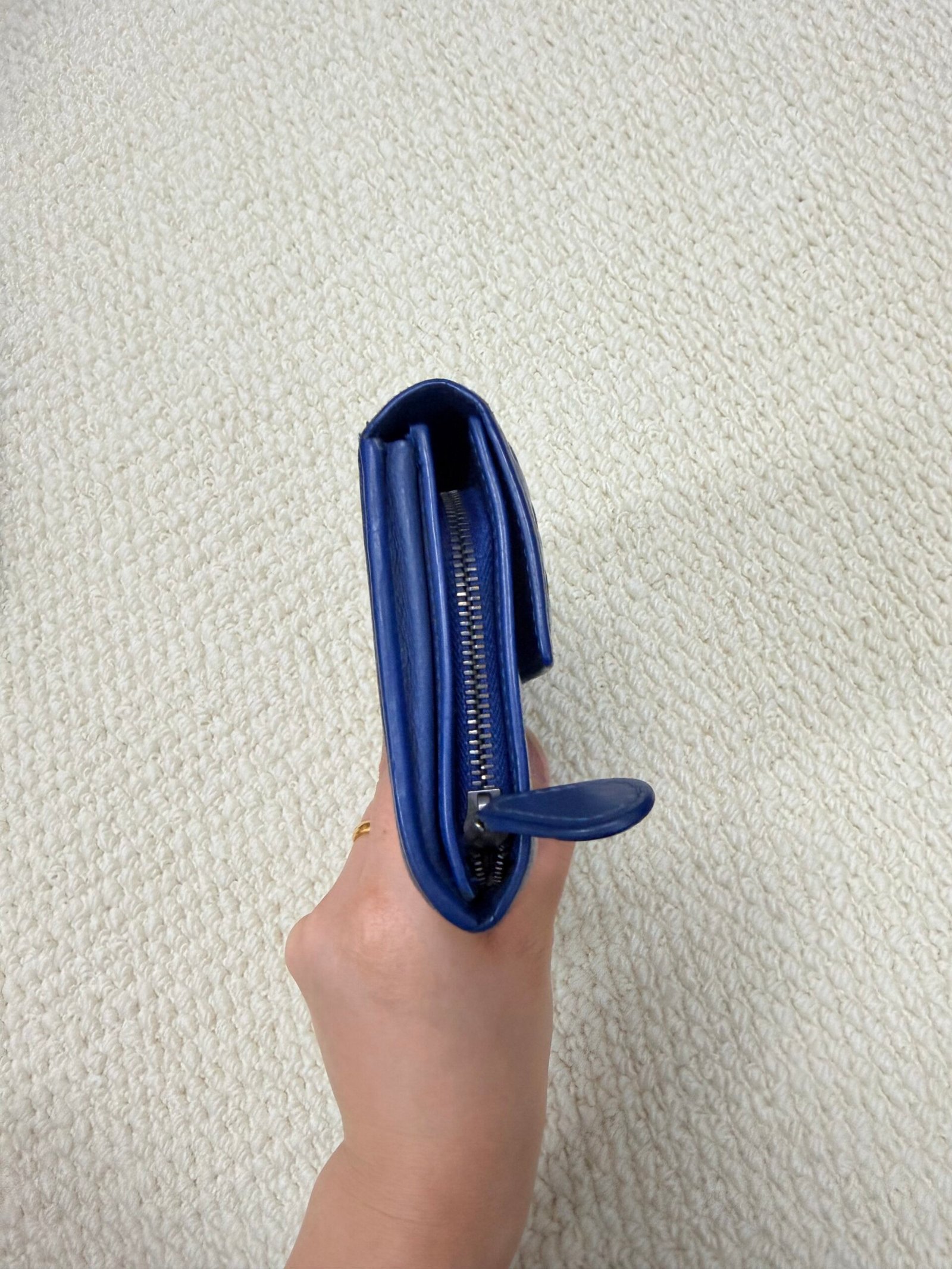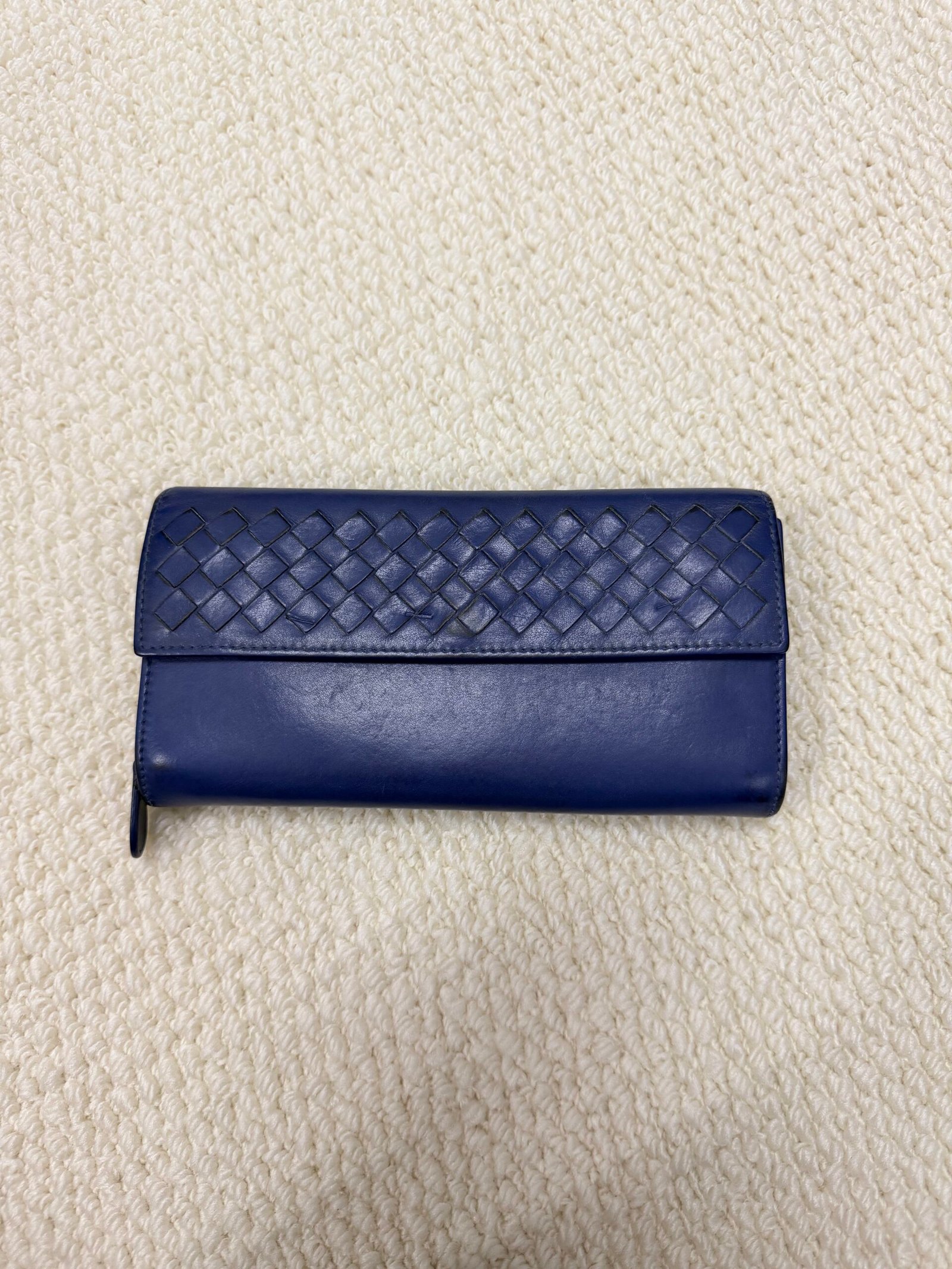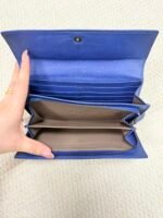 Crafted from buttery-soft lambskin leather in a rich navy blue shade, this iconic wallet features a two-tone design: the flap is adorned with Bottega Veneta’s signature handwoven Intrecciato pattern, while the base is smooth leather, showcasing the brand’s artisanal craftsmanship. The flap opens to a spacious interior with multiple card slots, bill compartments, and a zippered coin pocket, blending luxurious texture with practical functionality.