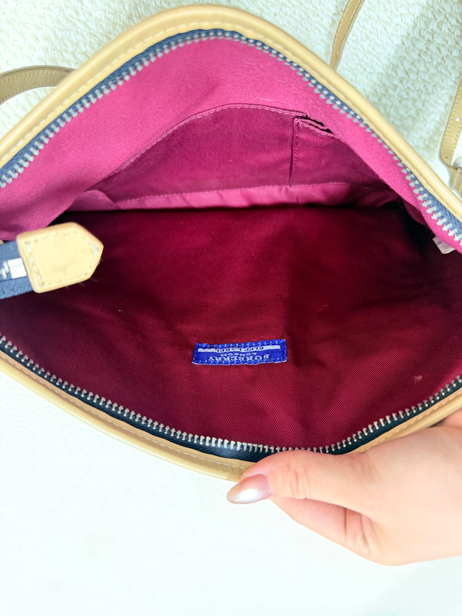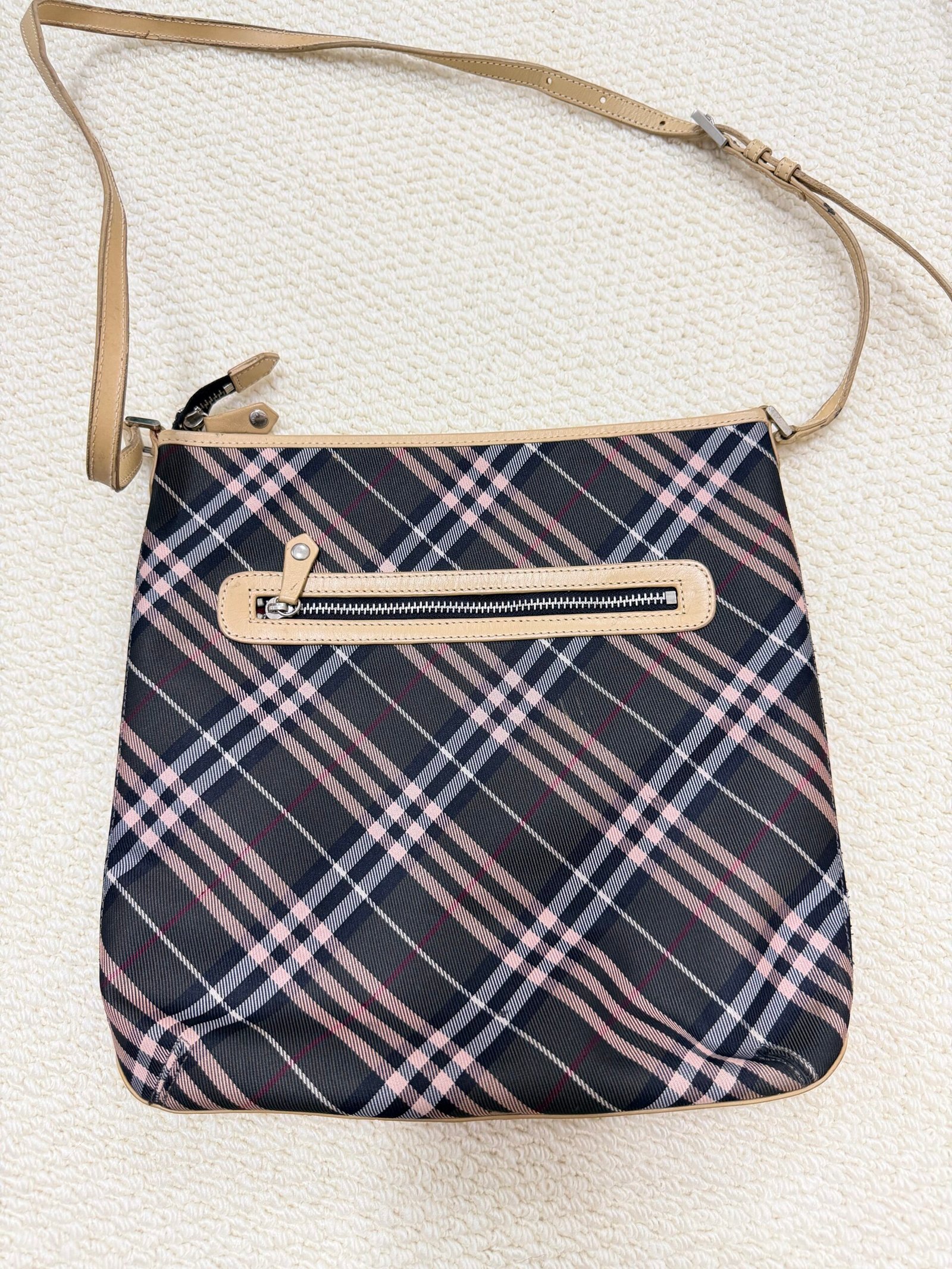 Crafted from Burberry’s iconic Nova Check coated canvas in a dark navy and pink colorway, this crossbody bag features smooth natural calfskin leather trim, a front zippered pocket for quick-access items, and an adjustable leather shoulder strap for comfortable crossbody wear. The spacious main compartment offers practical storage for daily essentials, blending the brand’s heritage Nova Check pattern with a casual, functional design that’s perfect for everyday use.
