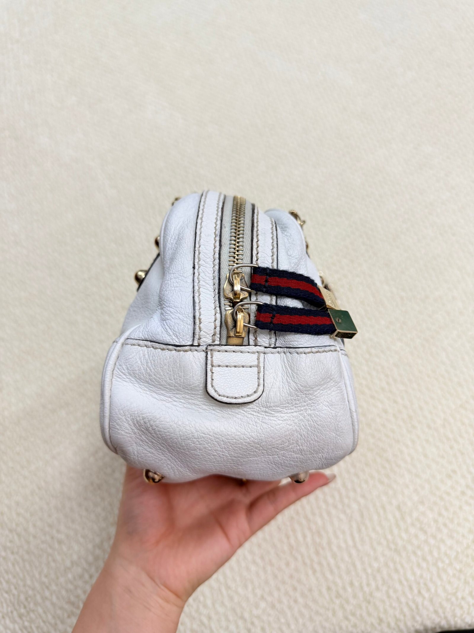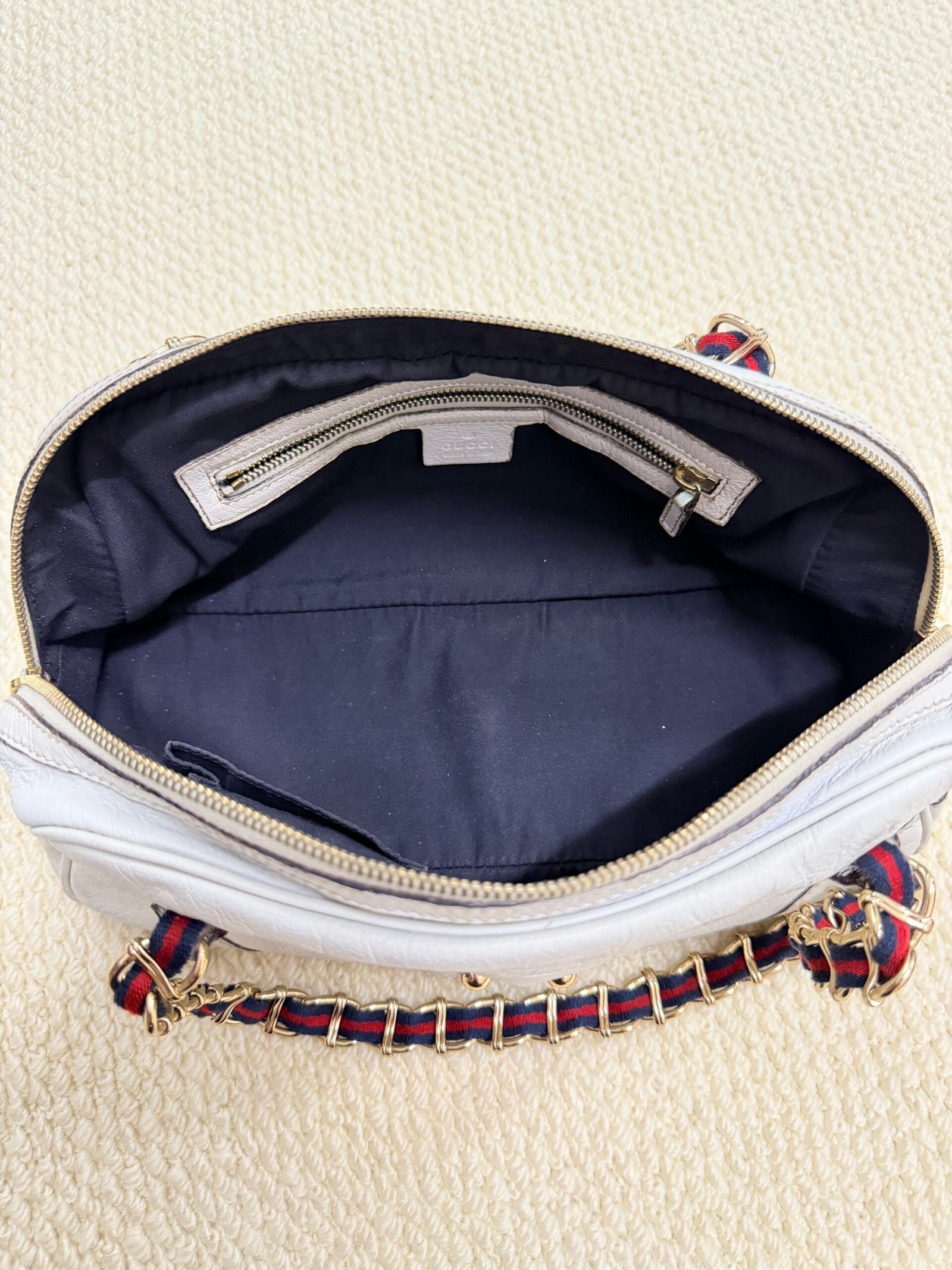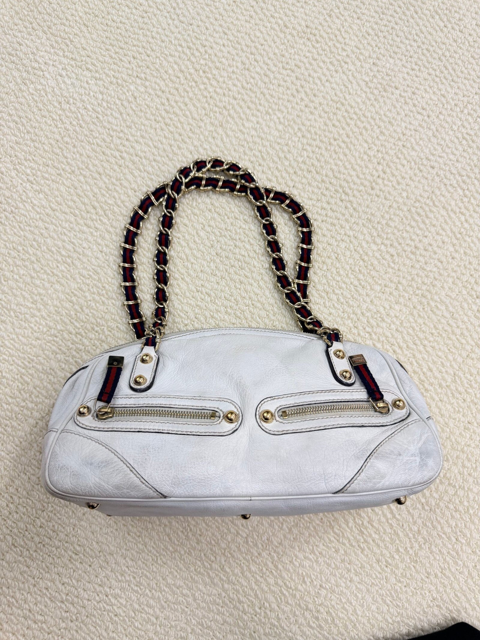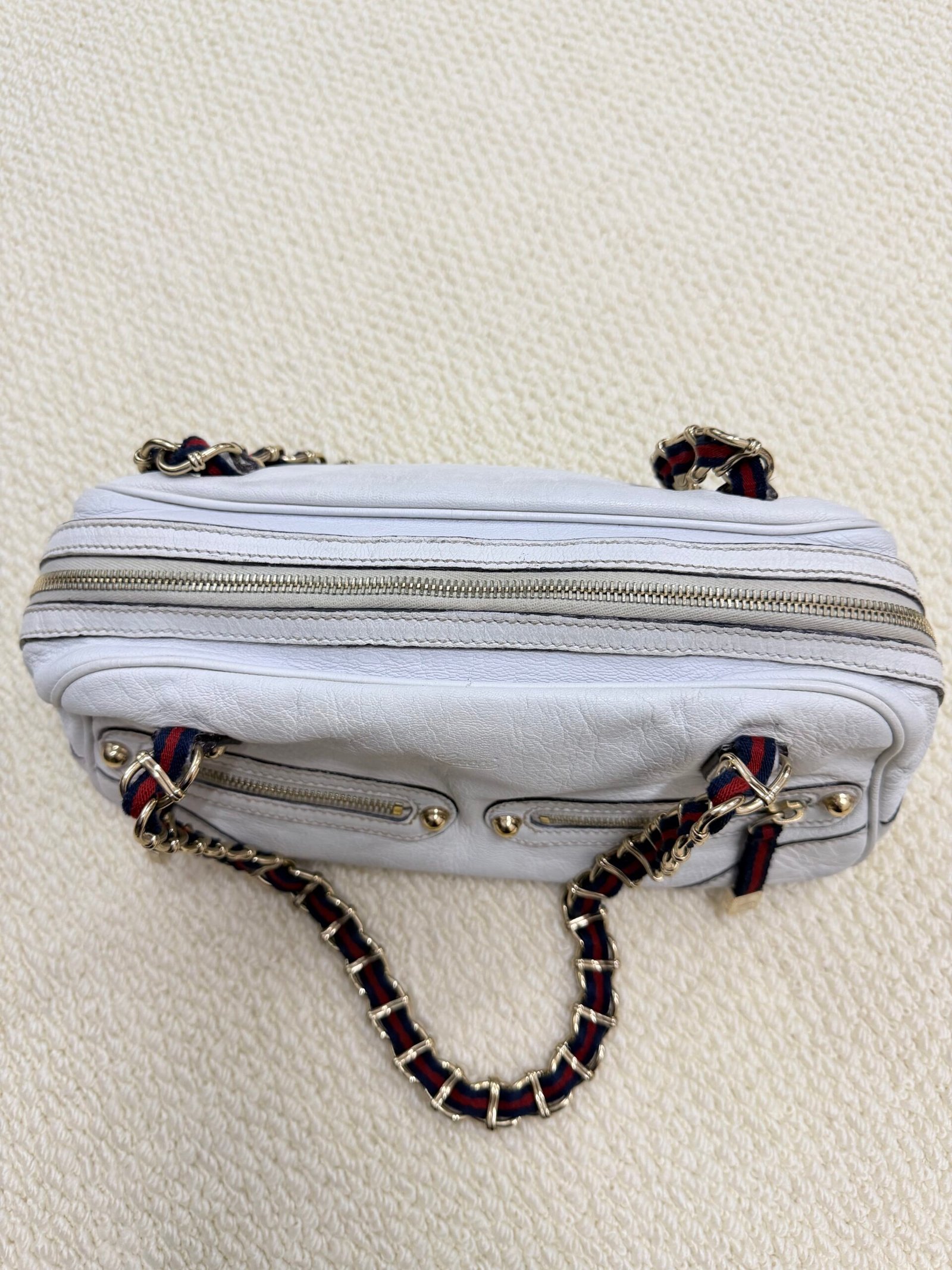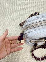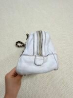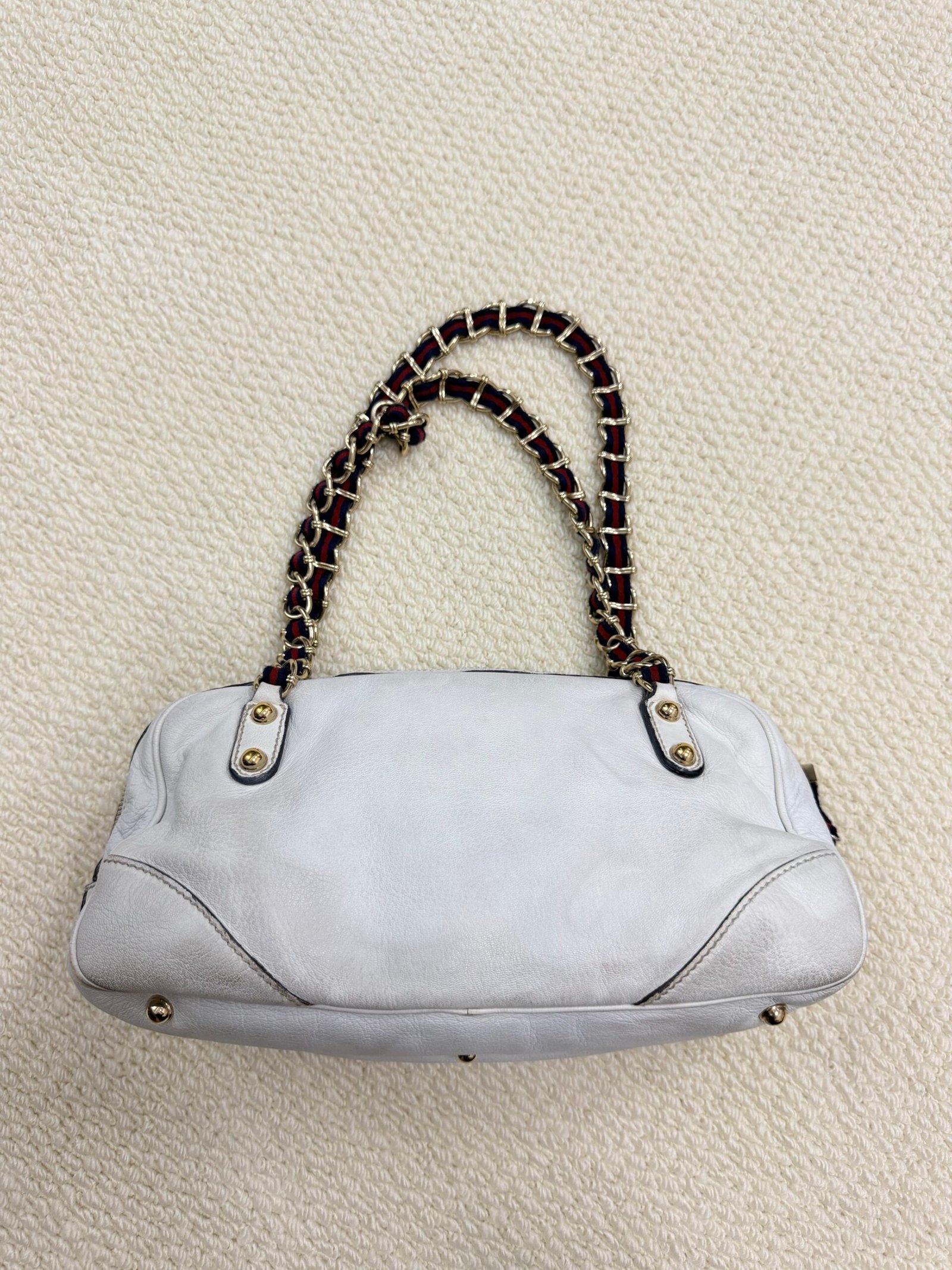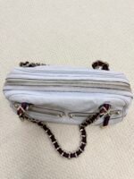 Crafted from buttery-soft white lambskin leather, this iconic bag features the signature interwoven chain-and-leather shoulder strap with red and navy web detailing, paired with polished gold-tone hardware. The slouchy, relaxed silhouette offers a spacious interior for daily essentials, blending Chanel’s timeless elegance with a playful, retro-inspired strap design.