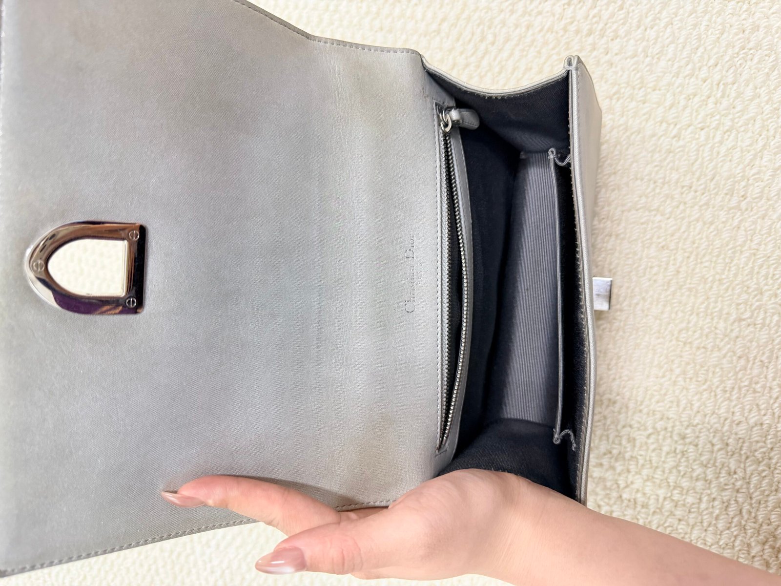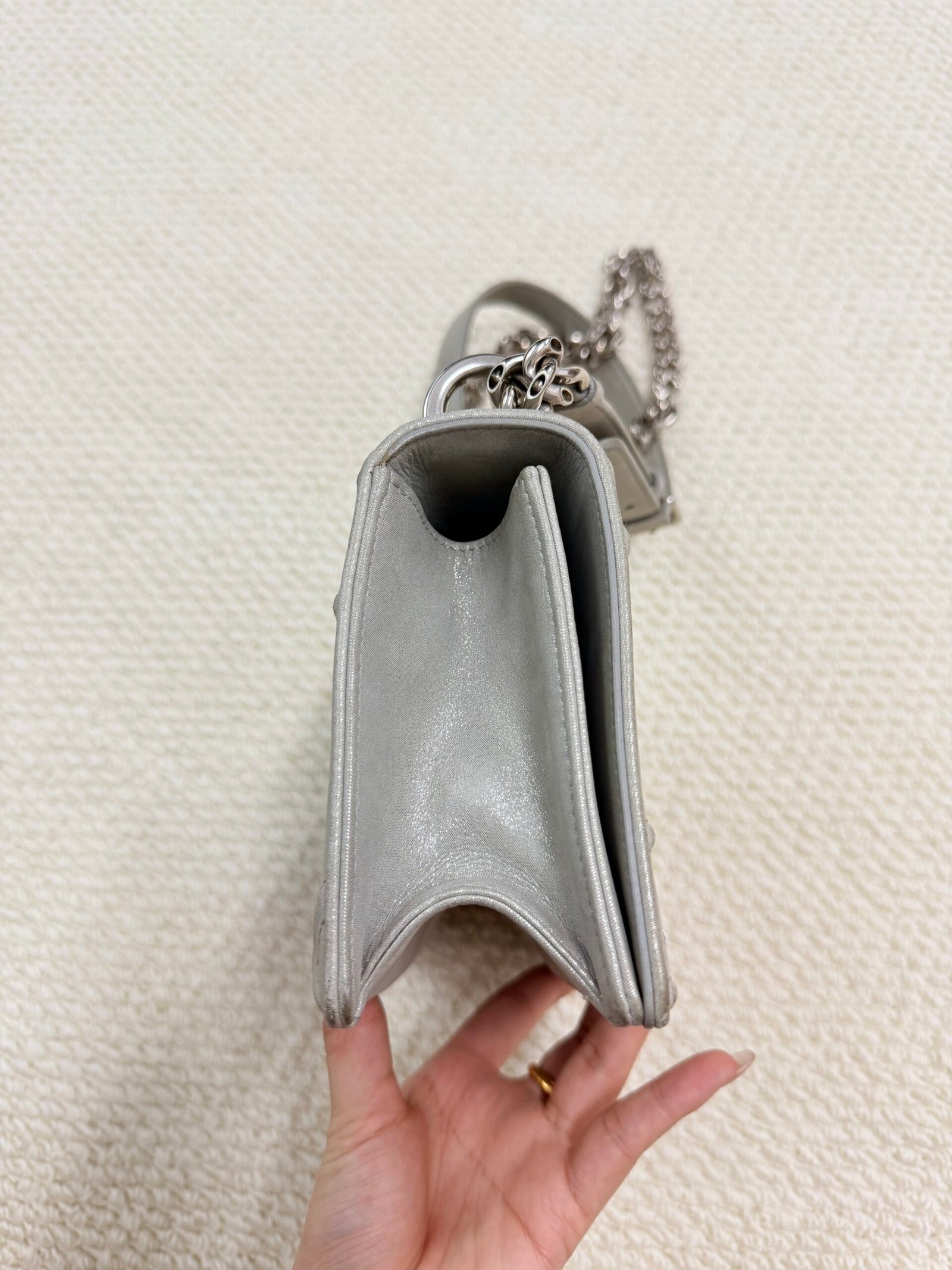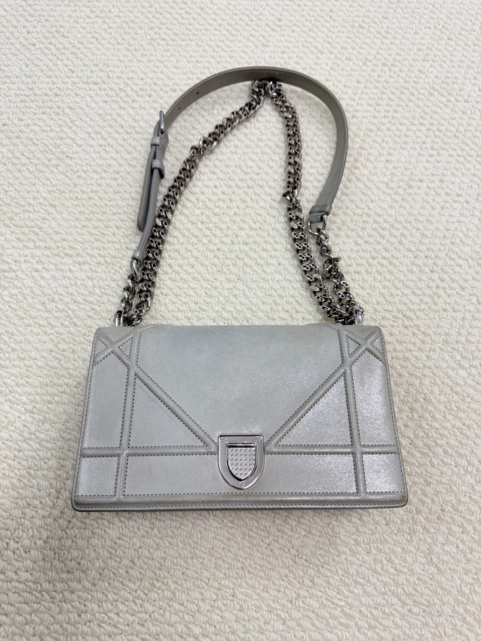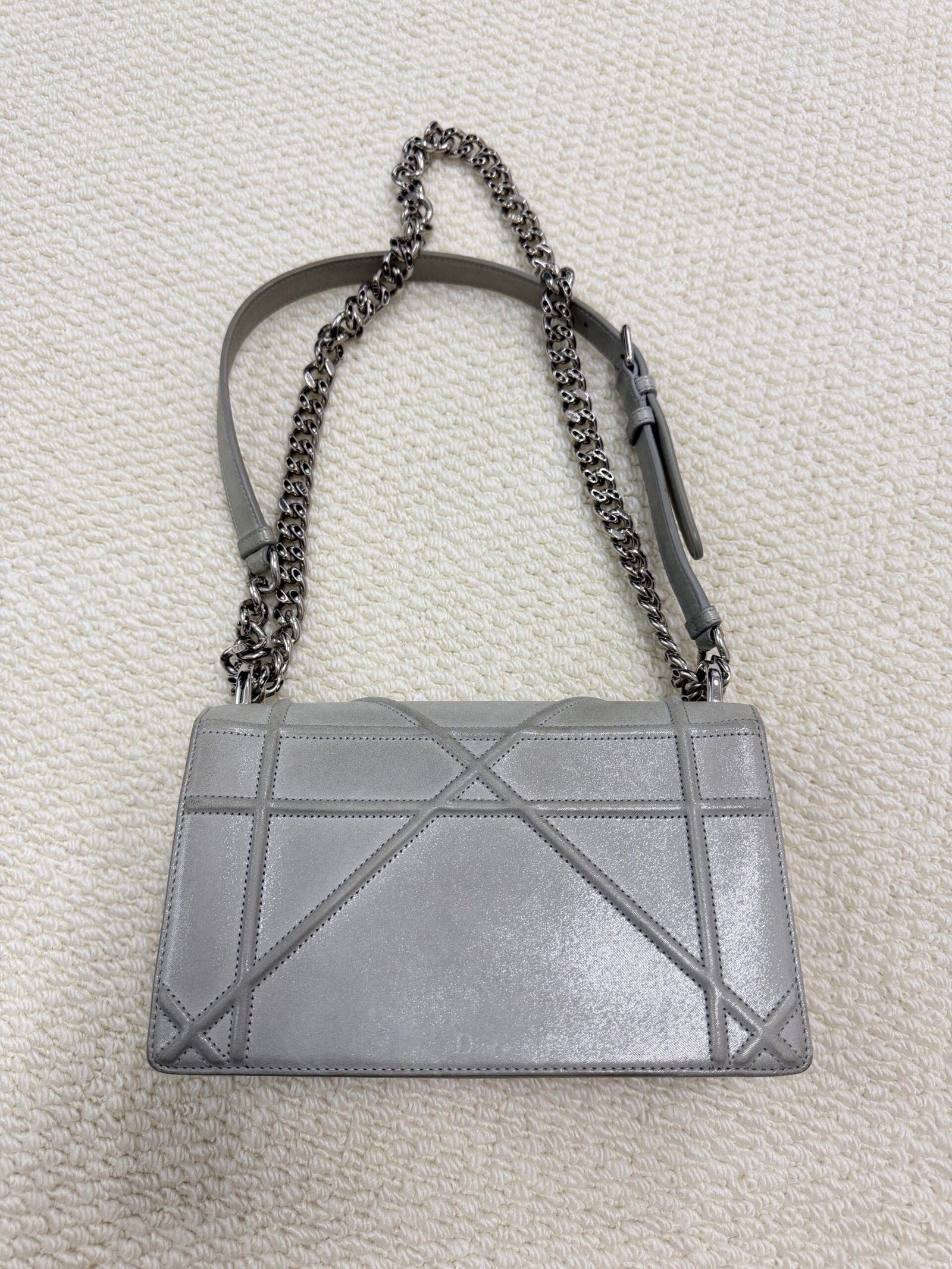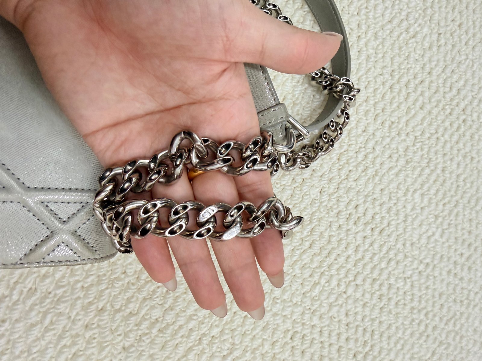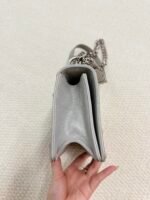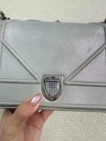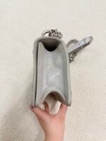 Crafted from sleek pale gray quilted calfskin leather, this iconic bag features the signature silver-tone shield-shaped CD lock closure at the center, paired with a convertible chain-and-leather shoulder strap that can be worn as a single strap or doubled for a shorter look. The spacious interior easily fits your phone, wallet, and daily essentials, making it perfect for both daytime errands and evening outings.