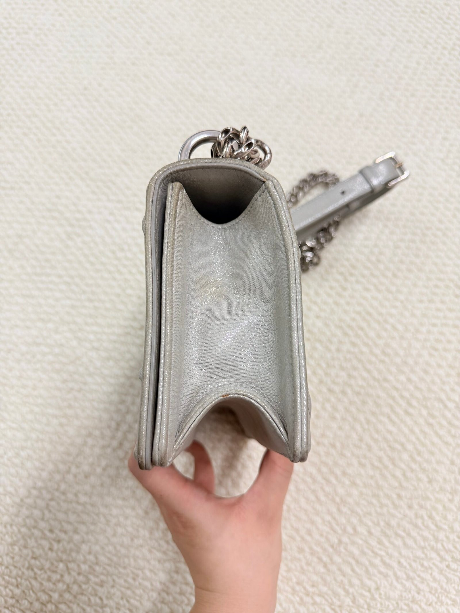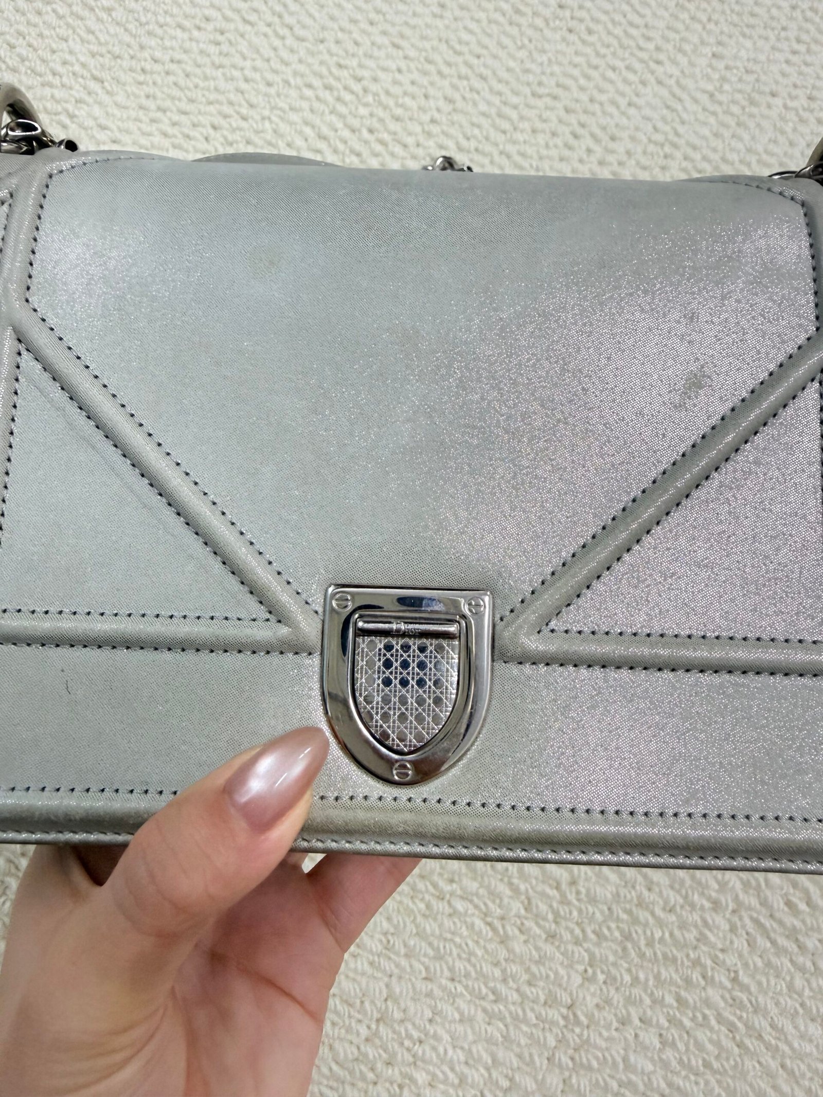 Great pre-owned condition — minor light wear on the hardware and leather edges, with the quilted pattern intact and the metallic finish remaining vibrant.