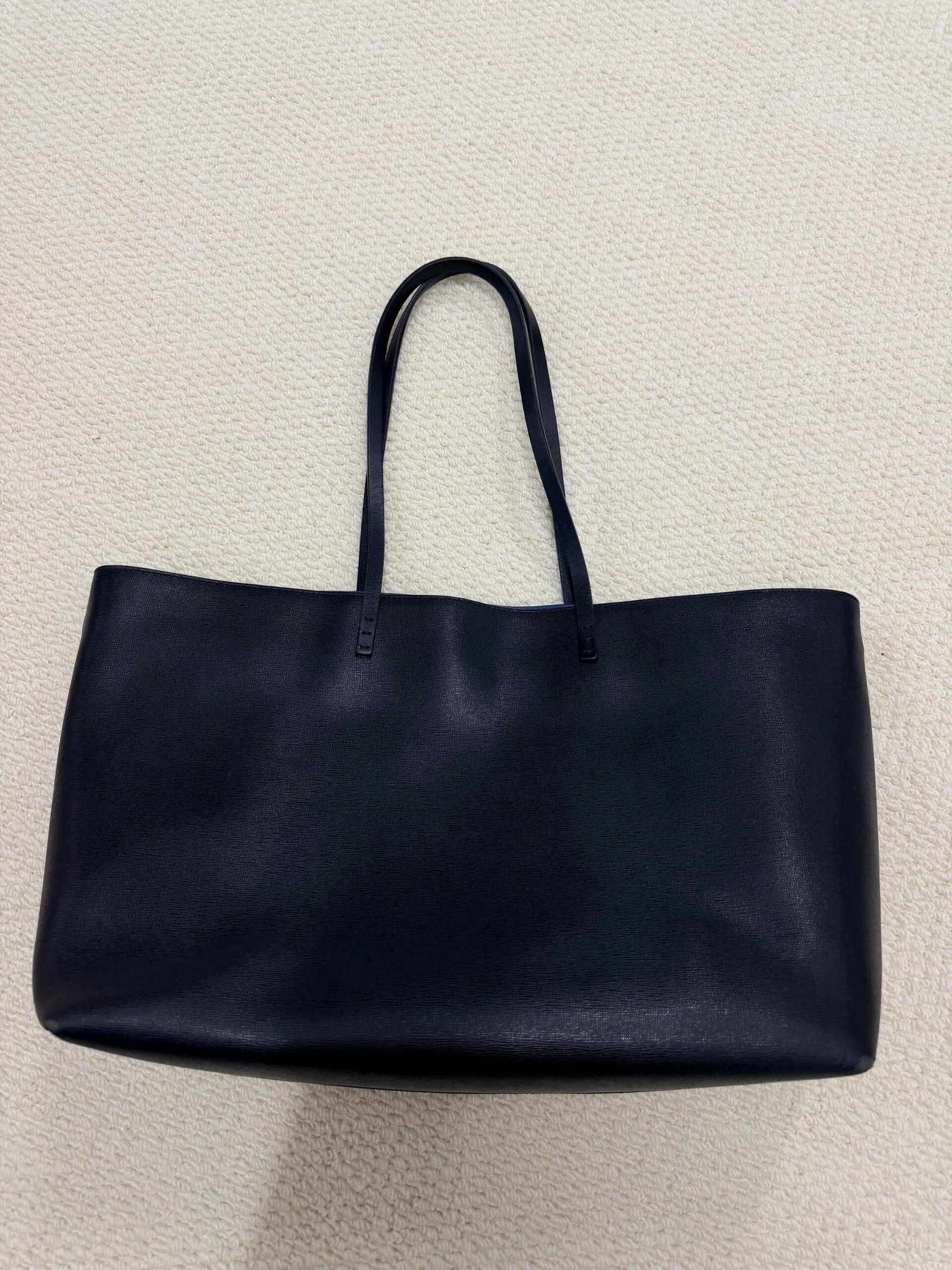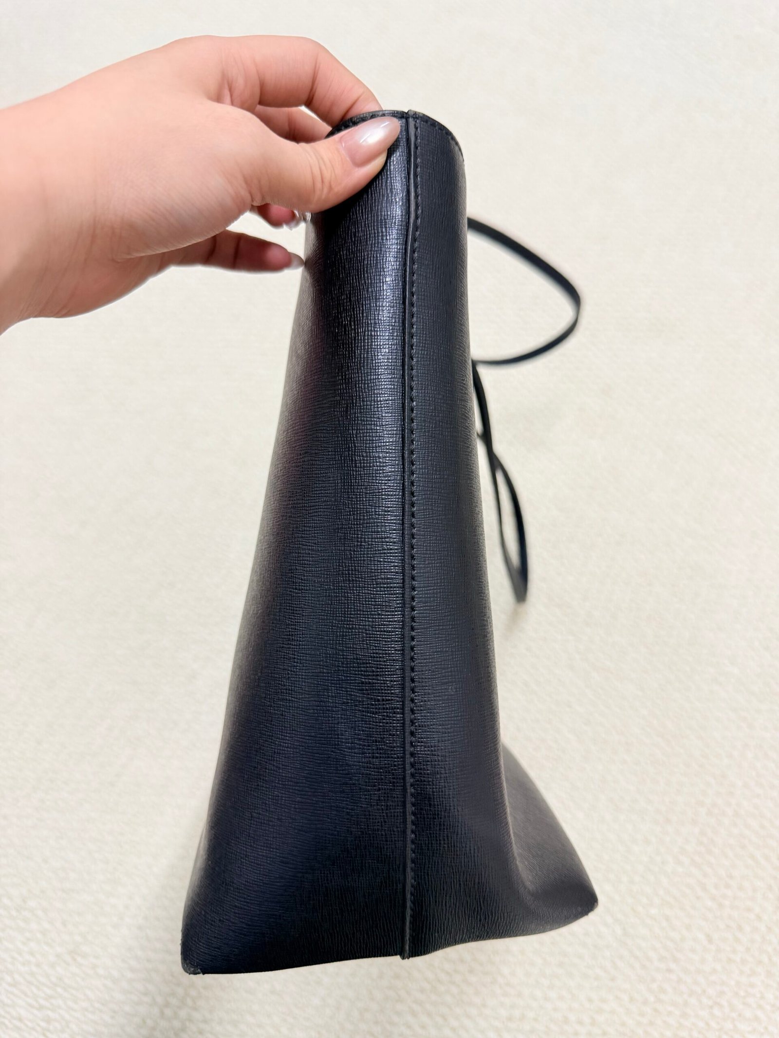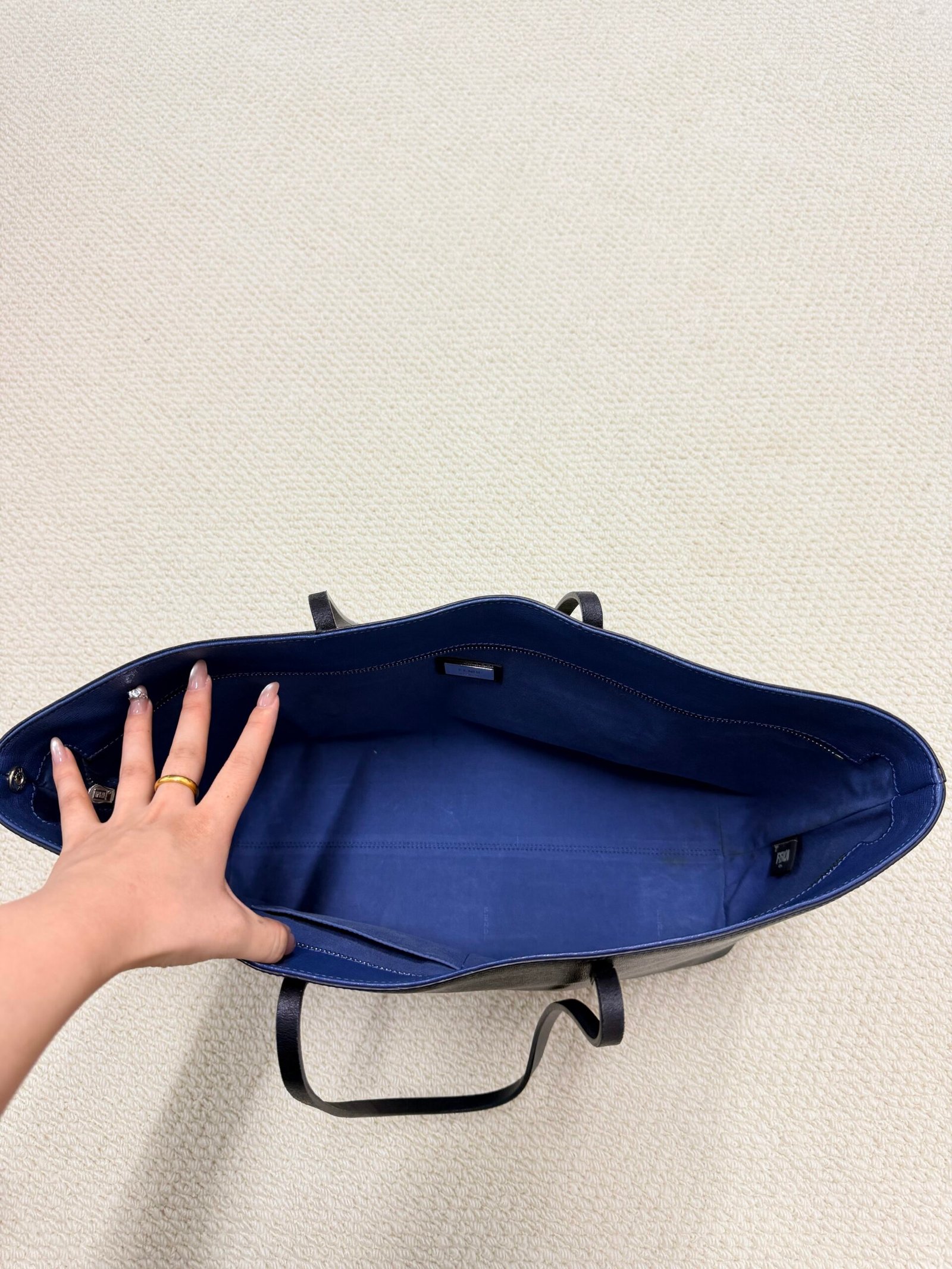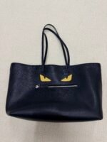 Crafted from durable black Saffiano leather, this iconic Roll Tote features Fendi’s playful yellow Bag Bugs eyes on the front, paired with a convenient front zippered pocket and long leather shoulder straps for comfortable over-the-shoulder wear. The extra-spacious interior easily fits your laptop, daily essentials, and more, blending the brand’s signature whimsical design with a practical, everyday silhouette.