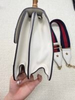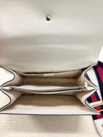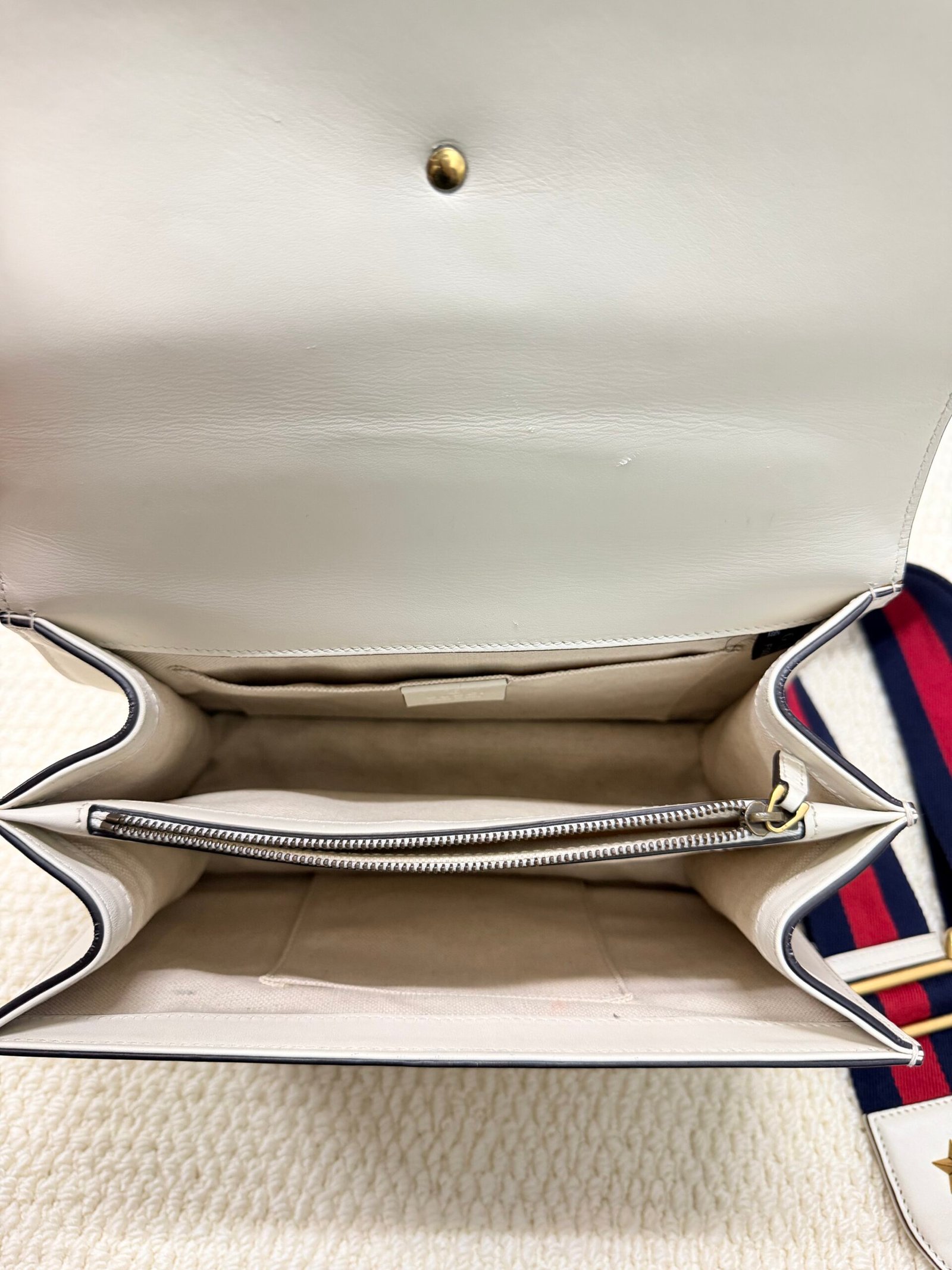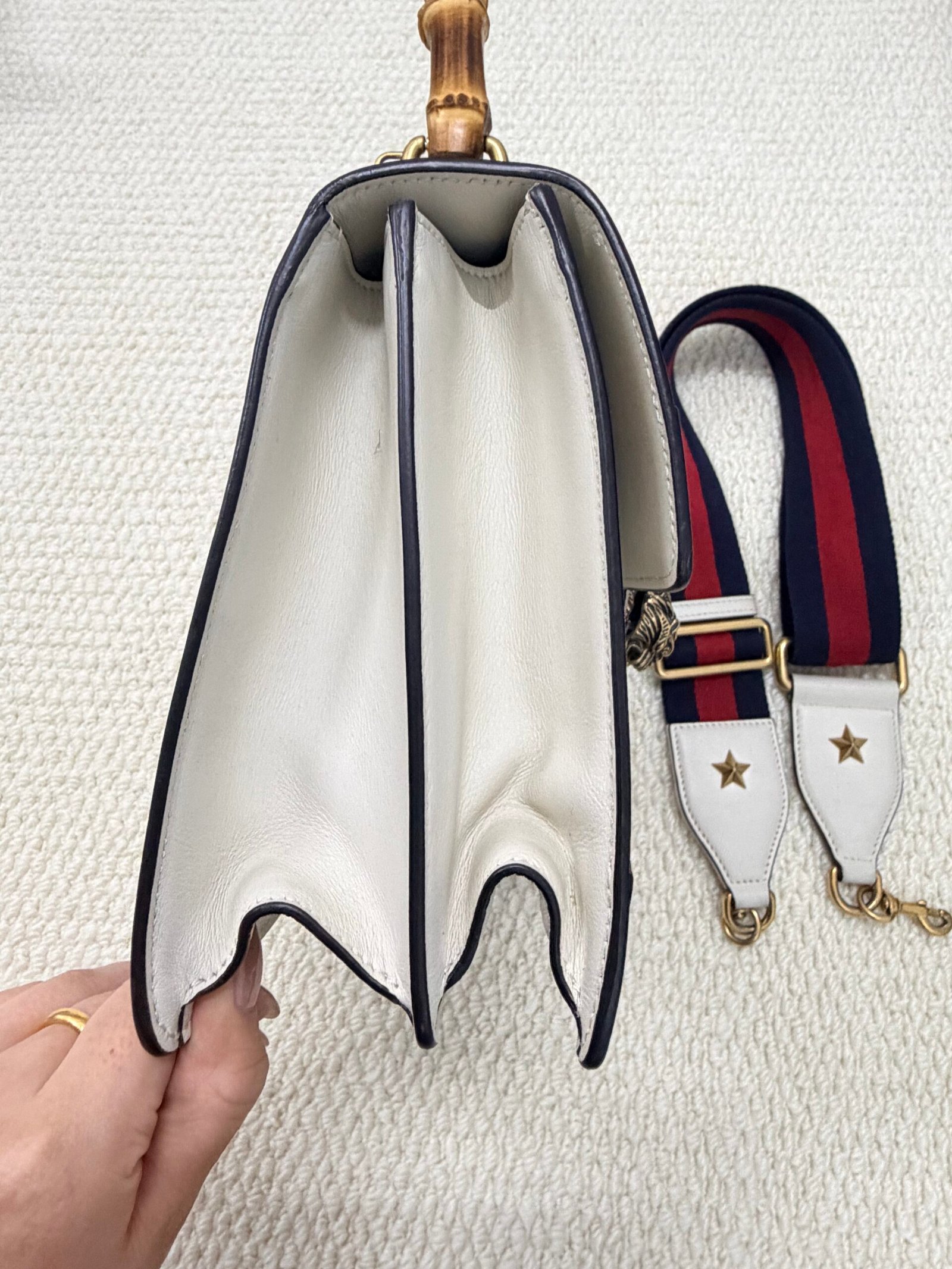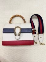 Crafted from smooth tri-color leather in white, navy, and red, this iconic bag features the signature Dionysus tiger head closure in antique gold-tone hardware, paired with Gucci’s heritage bamboo top handle. It comes with a detachable green and red web shoulder strap, allowing for versatile styling as a top handle, shoulder, or crossbody bag. The spacious interior easily fits your phone, wallet, and daily essentials.