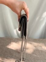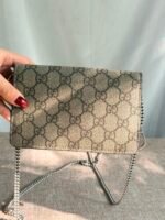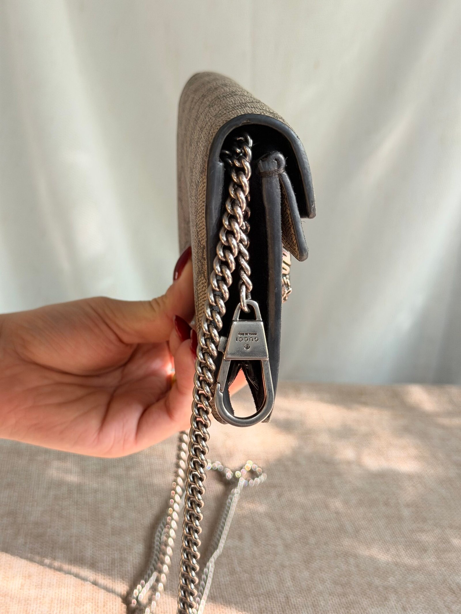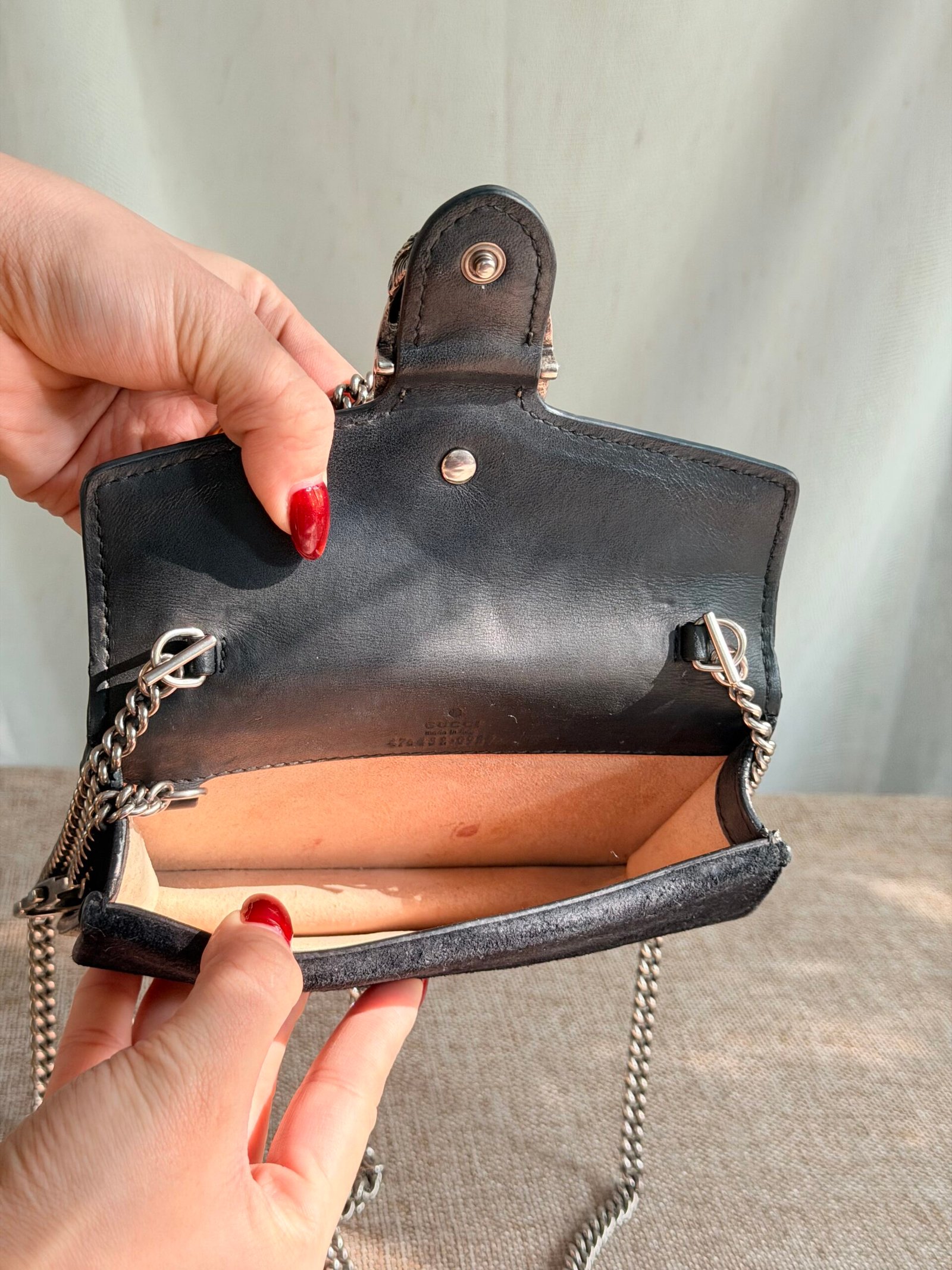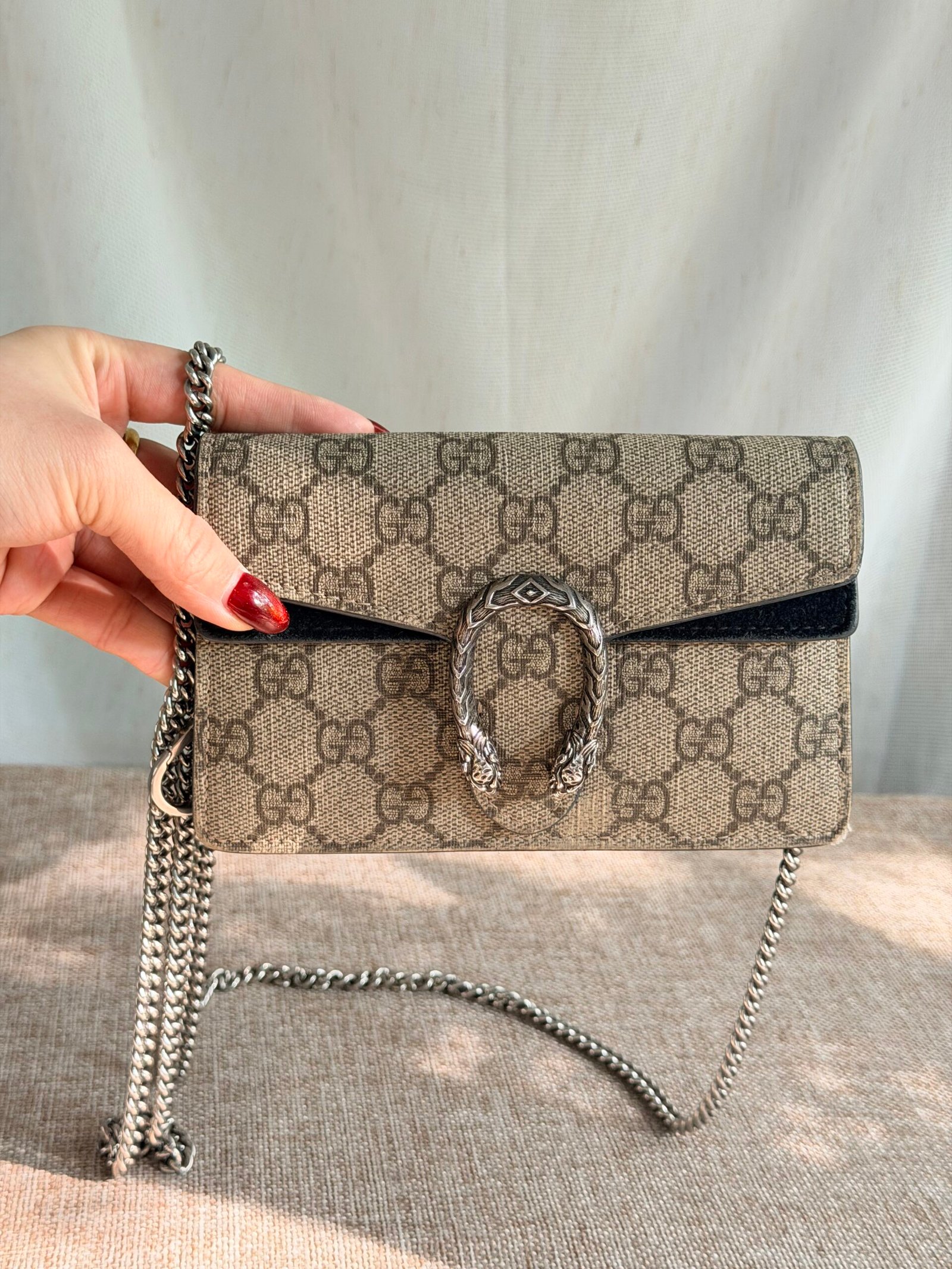 GG canvas + black velvet detail, silver-tone Dionysus snake clasp, chain strap (wear as crossbody/clutch; fits cards + small essentials).