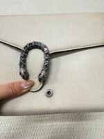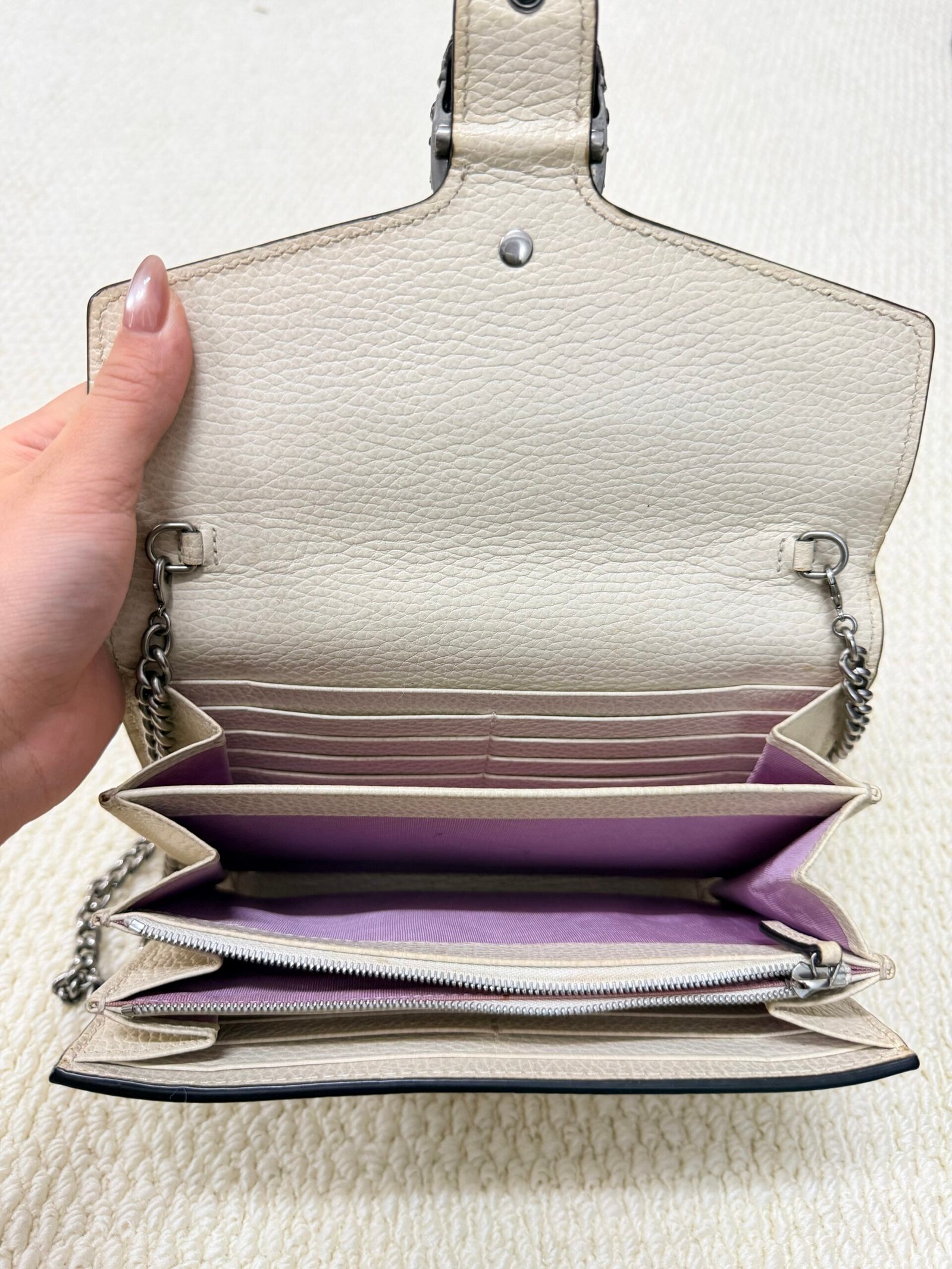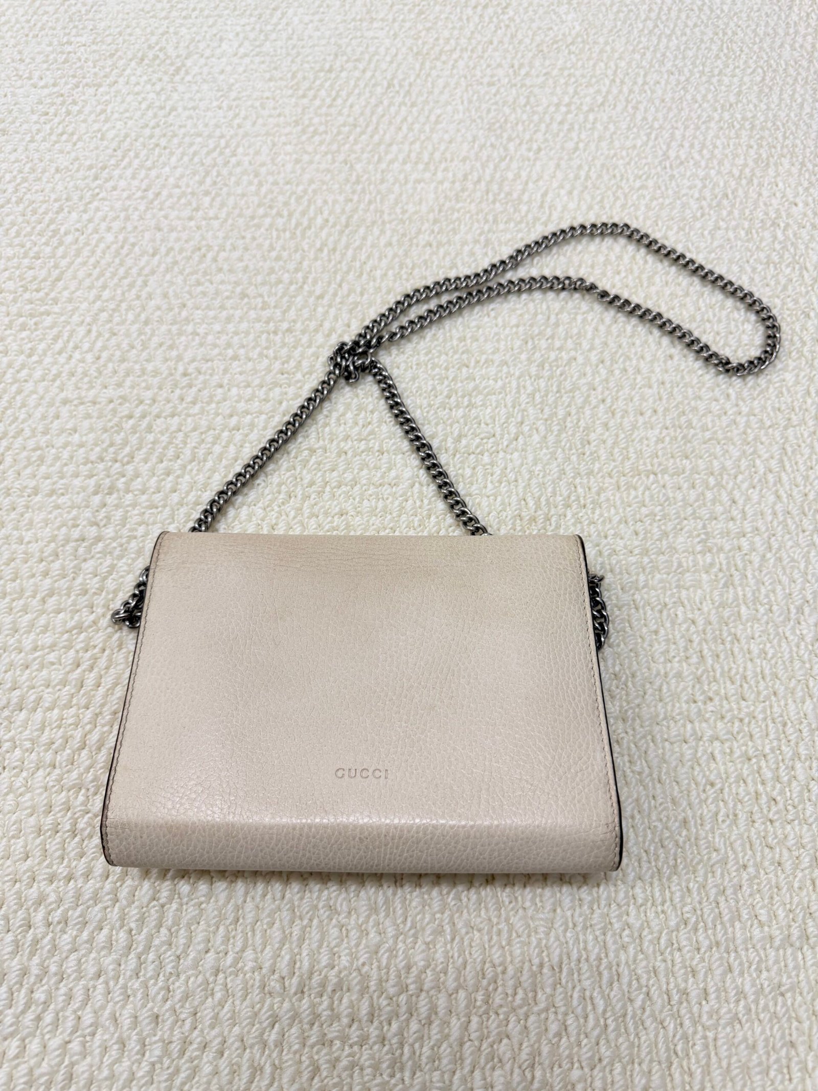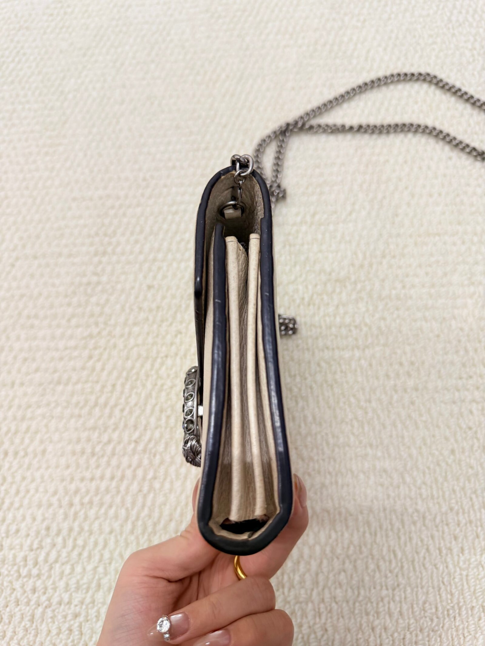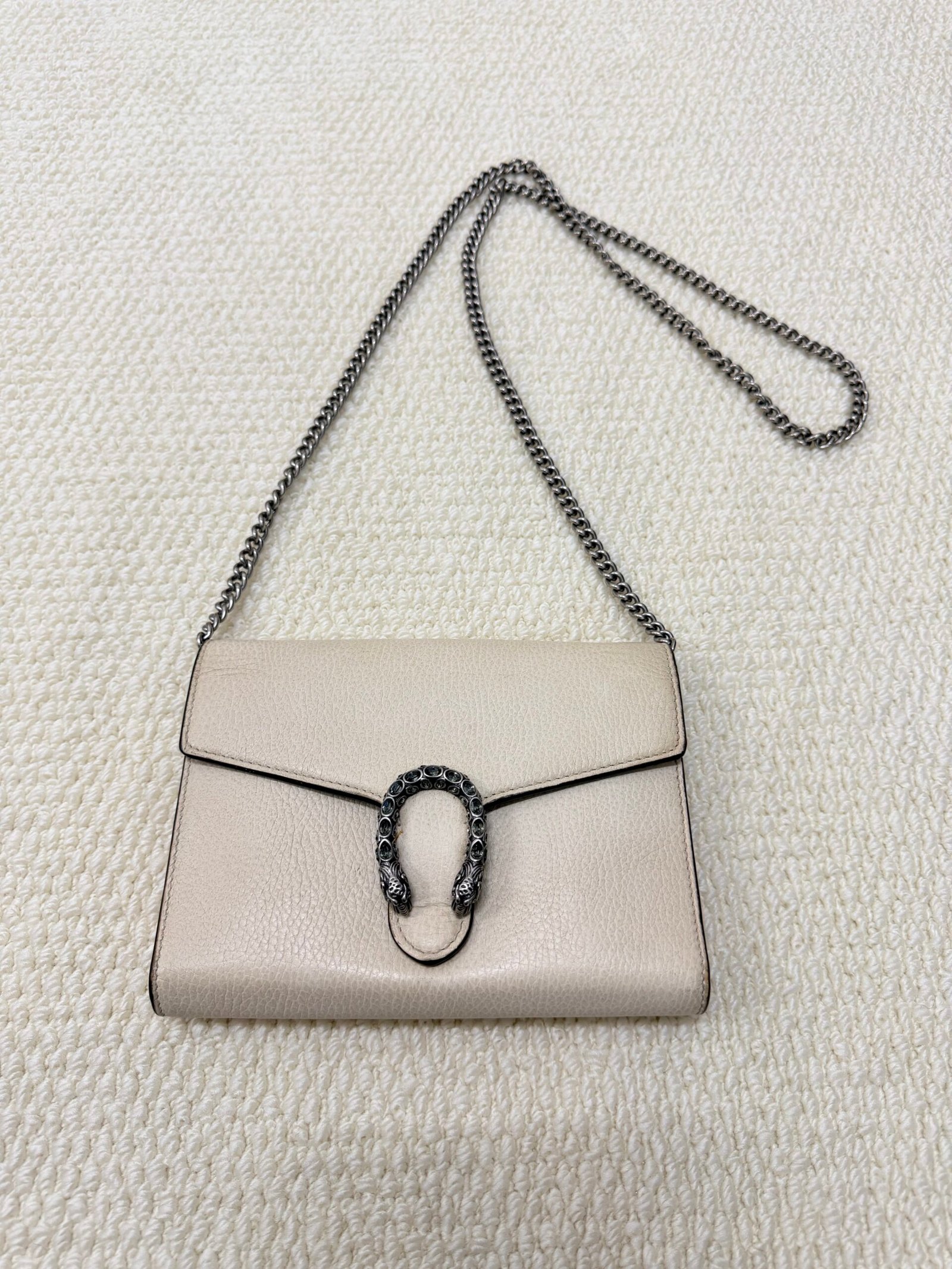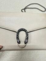 Crafted from creamy pebbled leather, this iconic piece features the signature antique silver-tone tiger head closure — a hallmark of the Dionysus line. The adjustable silver-tone chain strap lets you wear it crossbody or as a shoulder bag, and the compact yet roomy interior fits your phone, cards, lip gloss, and daily small essentials with ease.
