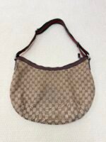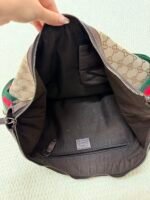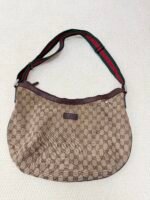 Crafted from Gucci’s iconic GG Supreme canvas in the classic beige/ebony colorway, this Hobo bag features smooth dark brown leather trim, the signature green and red Web shoulder strap (adjustable for comfortable crossbody wear), and a subtle Gucci logo plaque on the front. The slouchy, crescent-shaped silhouette opens to a spacious zip-top interior, blending the brand’s heritage GG monogram with a casual, everyday design perfect for errands or travel.