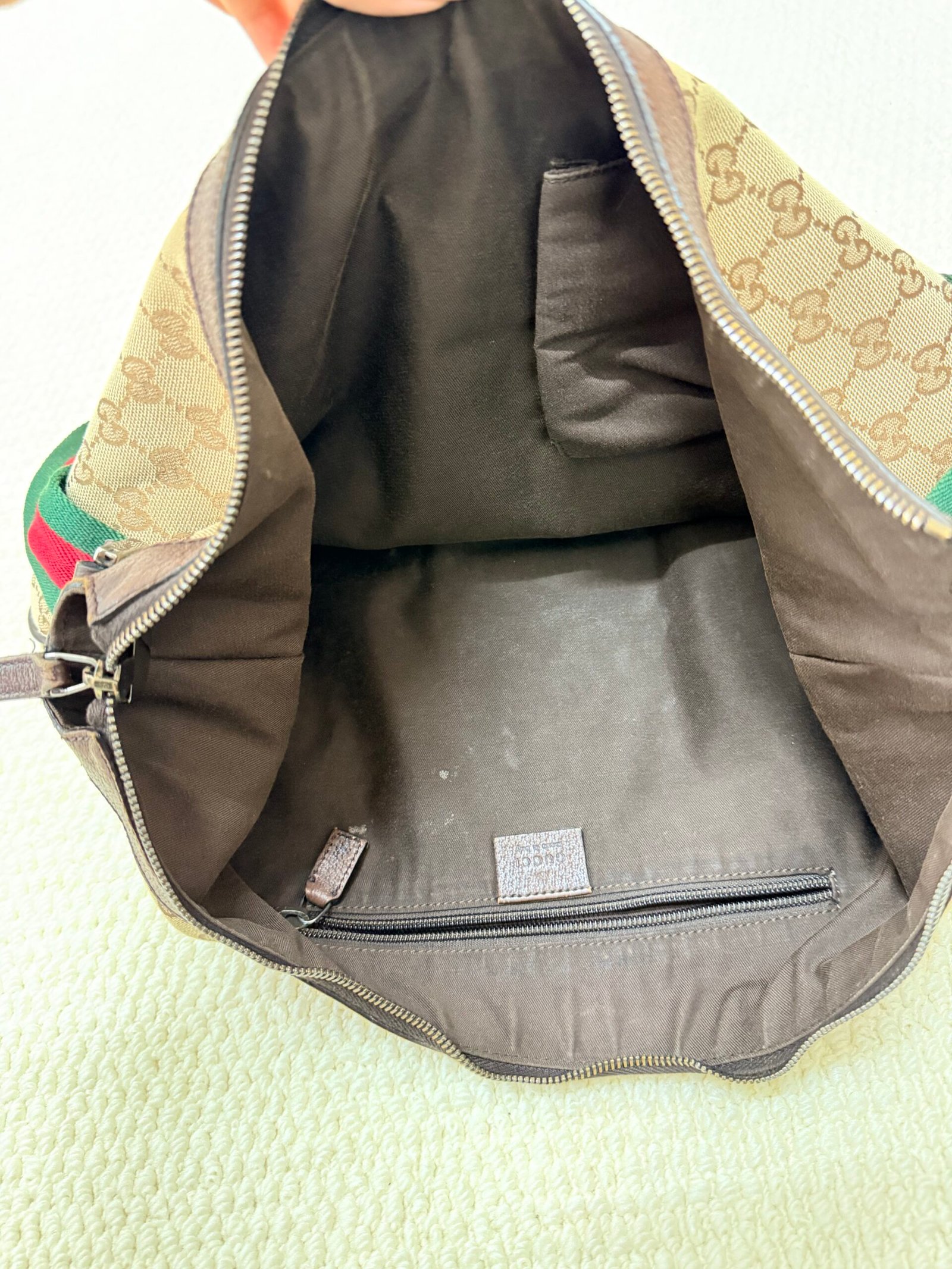 Great pre-owned condition — minor light wear on the leather trim and hardware, with the GG canvas intact and the Web strap colors still vibrant.