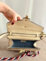 Crafted from smooth, premium leather, this bag is adorned with Gucci’s iconic embossed bee and star motifs—exuding a rich vintage luxury vibe. It features the brand’s classic navy/red Web stripe and gleaming gold-tone chain hardware, making it instantly recognizable. The bag comes with a delicate top handle for an elegant silhouette, plus an adjustable red/white/blue woven shoulder strap that lets you wear it as a crossbody or shoulder bag. Perfect for brunch dates, romantic nights out, or adding a touch of luxury to your everyday look, it easily fits your phone, cardholder, and go-to lipstick.