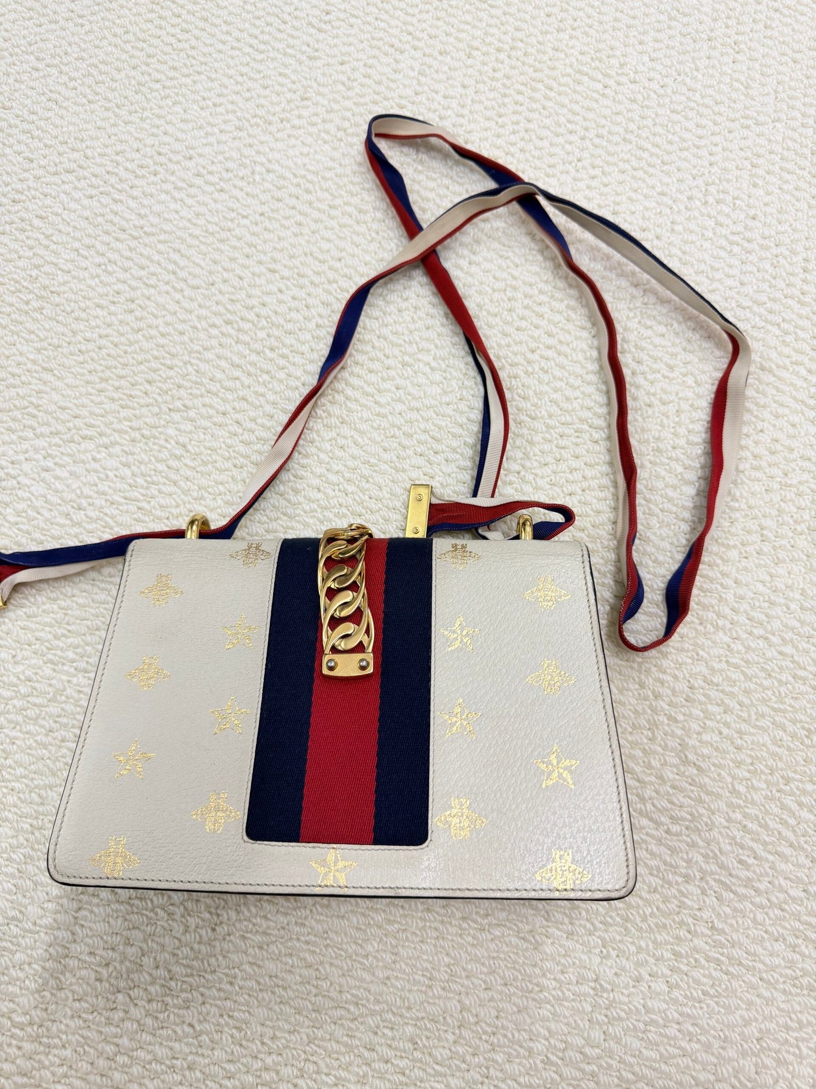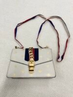 Crafted from smooth white grained leather, this iconic Sylvie bag features whimsical gold-tone bee and star prints across the surface, paired with Gucci’s signature red and navy web stripe at the front flap. The design is anchored by a bold gold-tone chain and buckle closure, and it comes with a detachable, adjustable red-white-navy web shoulder strap for versatile styling as a shoulder or crossbody bag. The spacious interior fits daily essentials, balancing playful design with practical functionality.