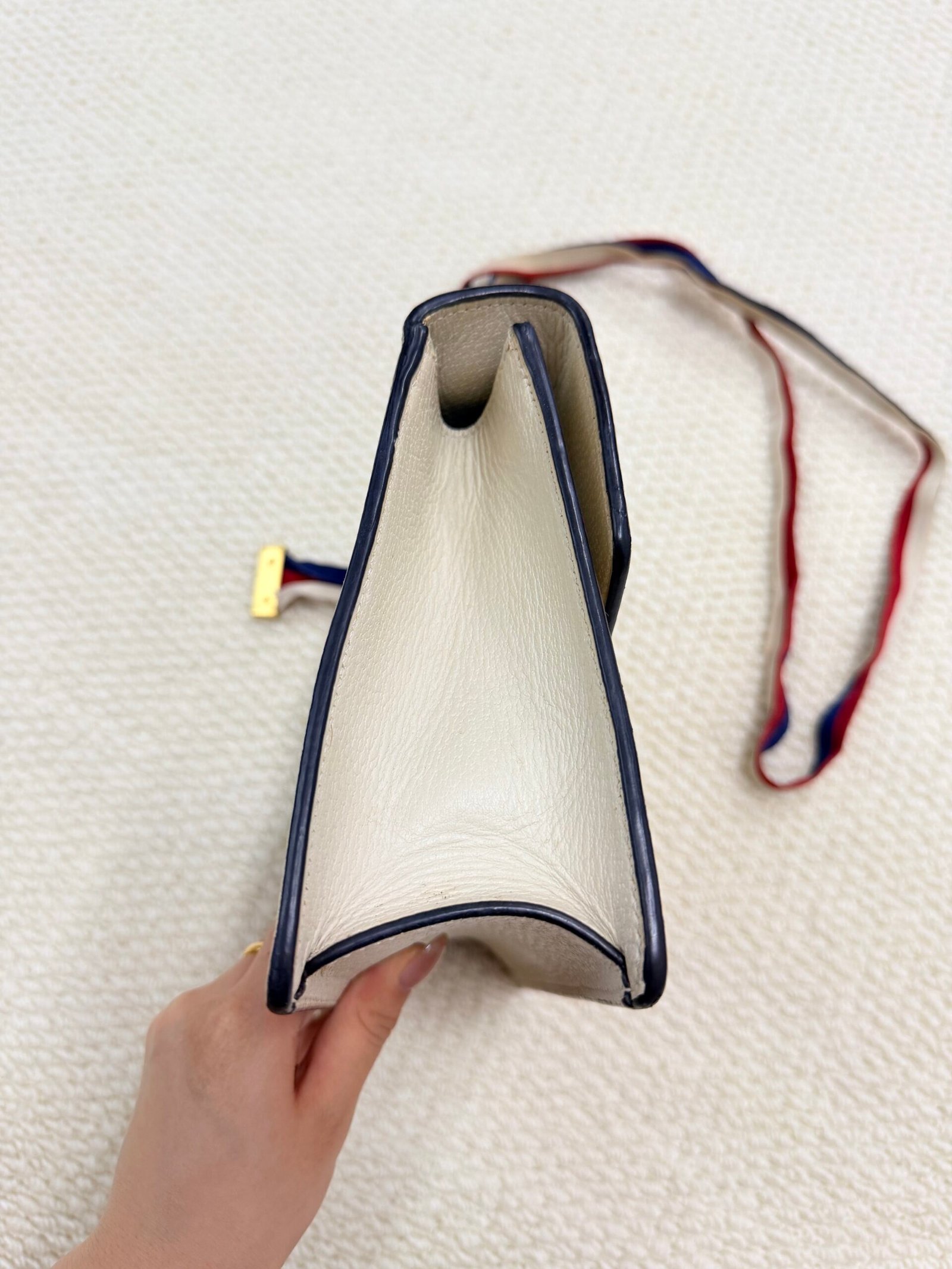 Great pre-owned condition — minor light wear on the hardware and leather edges, with the prints and web stripe intact, and the white leather still bright.