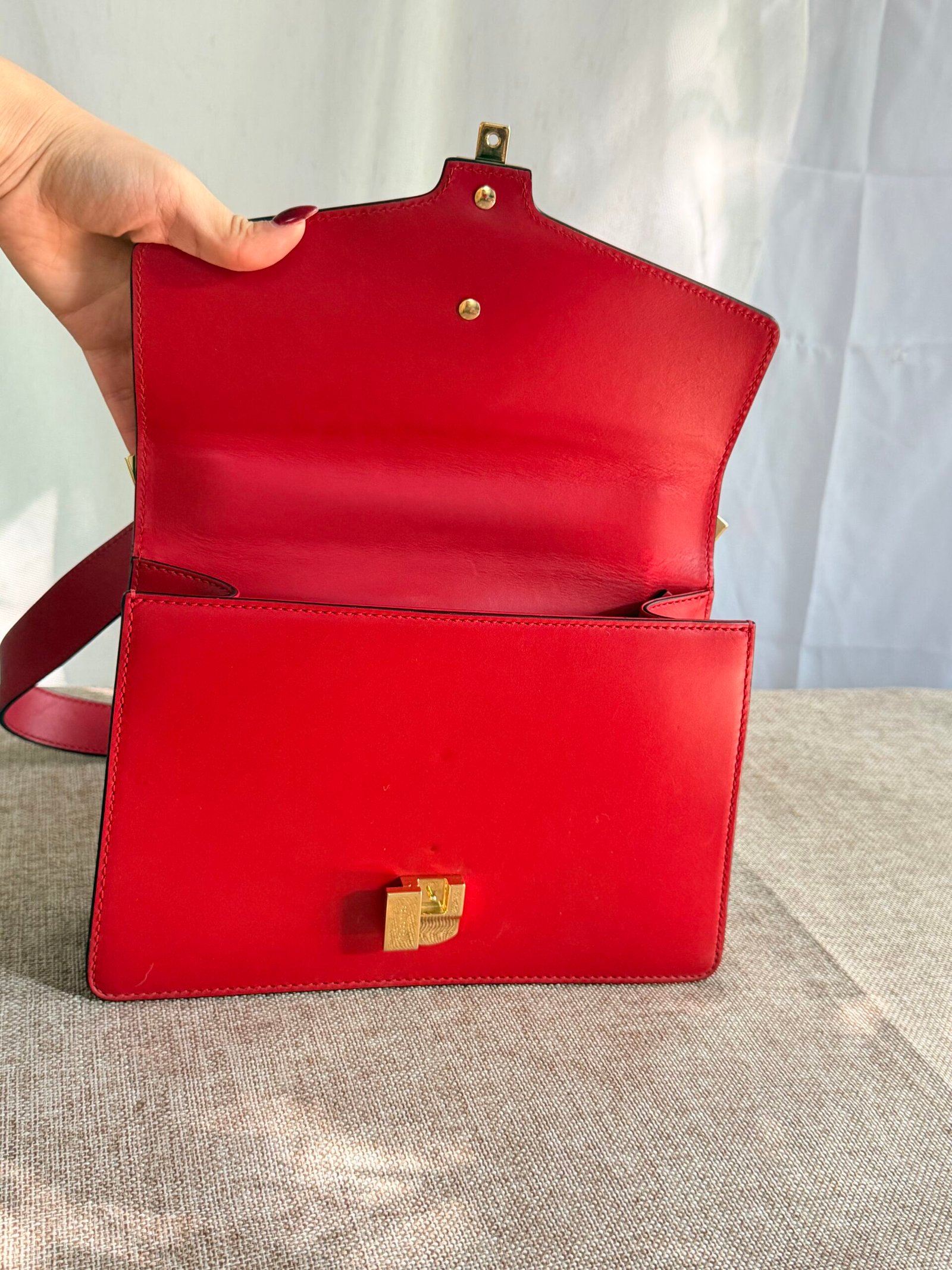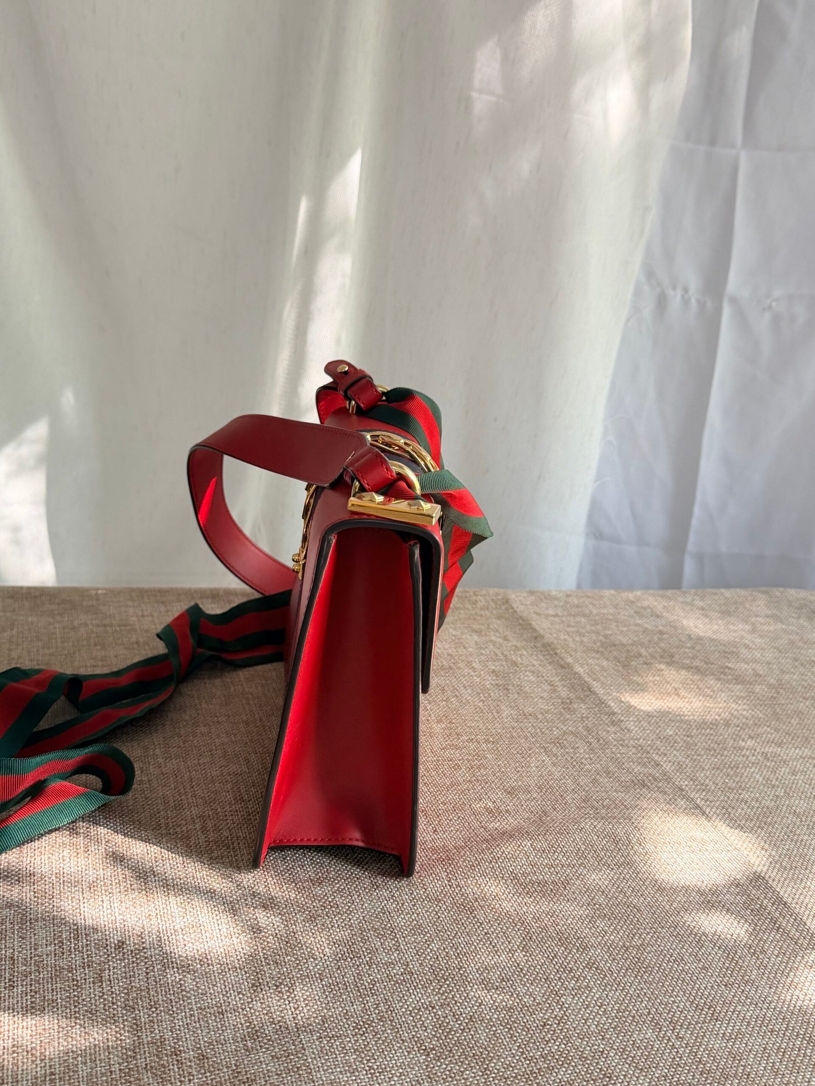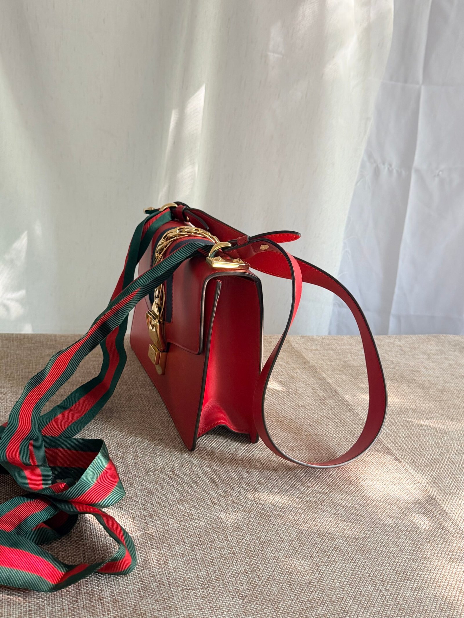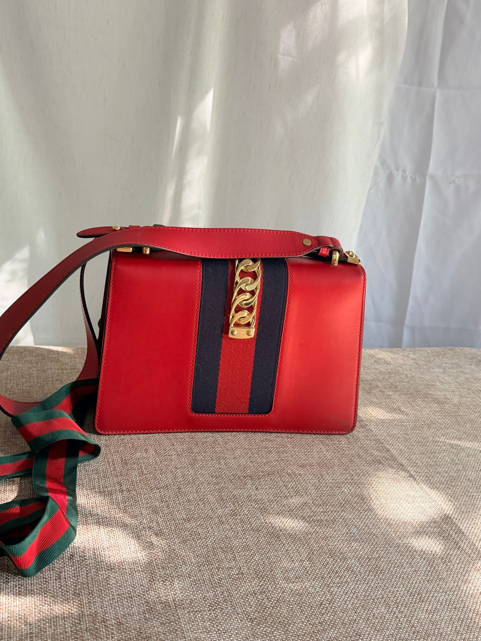 Red leather, navy webbing + gold chain detail, Gucci metal buckle, red-green webbing adjustable strap (wear as crossbody/shoulder bag; fits phone + small essentials).