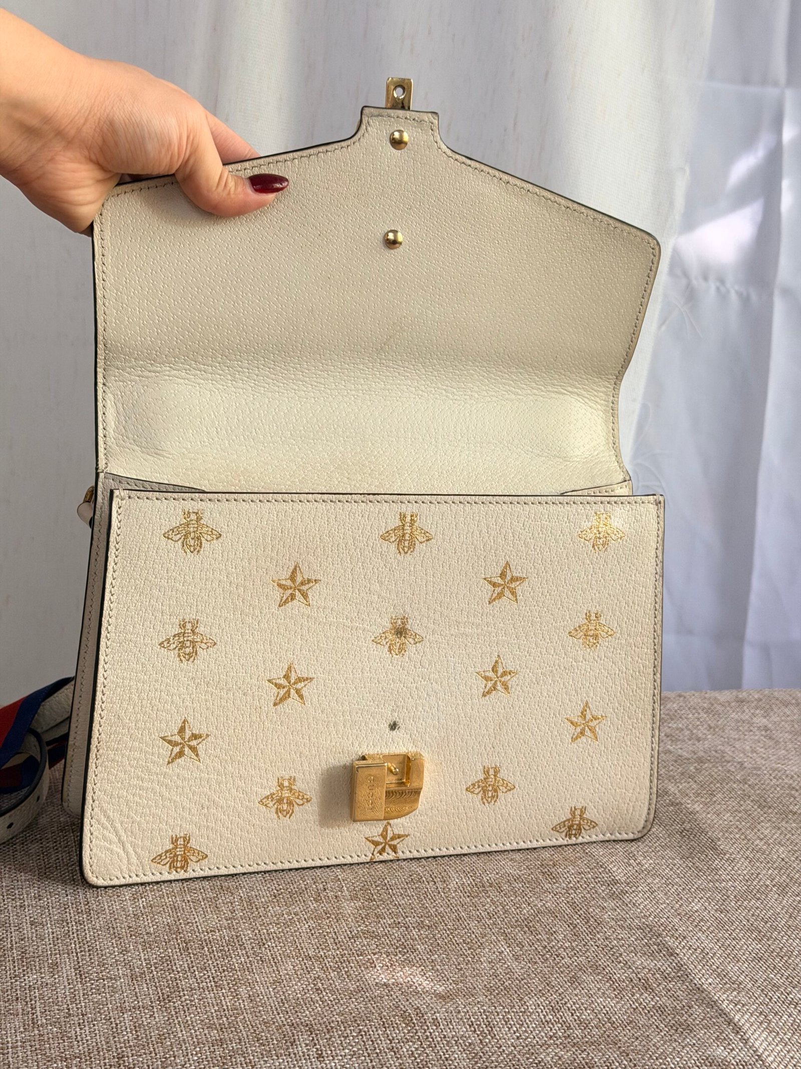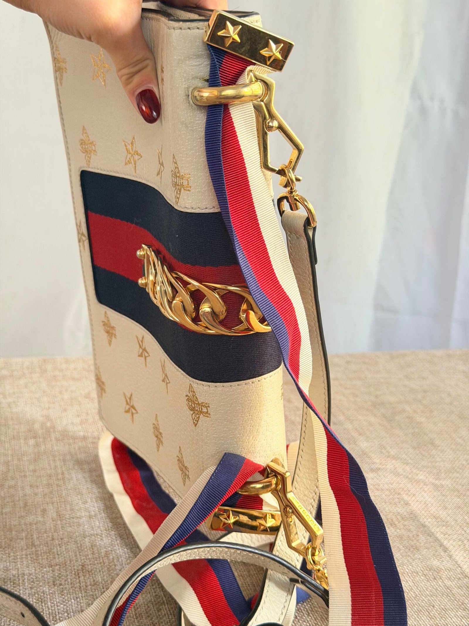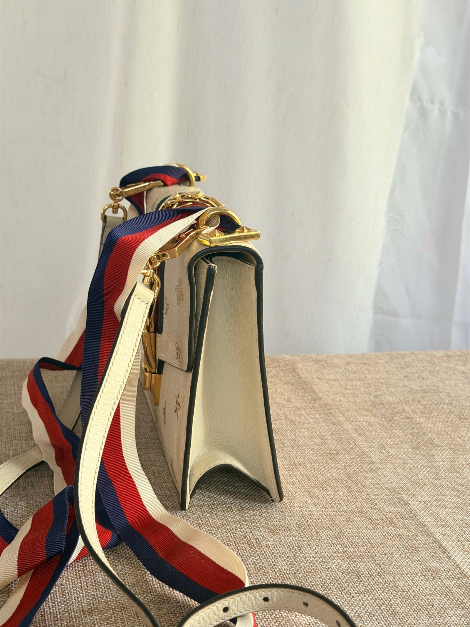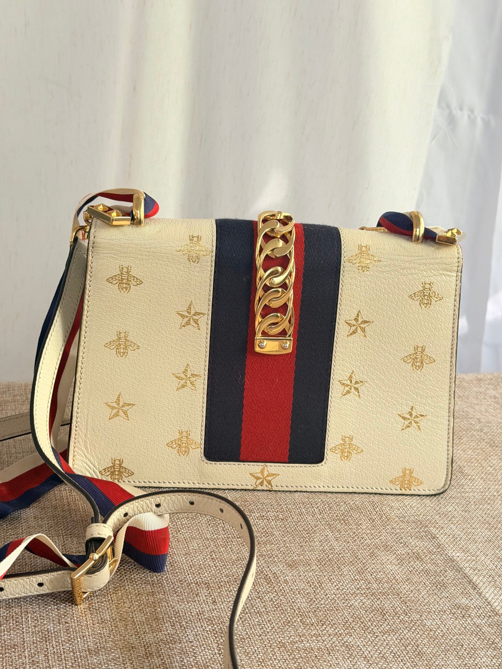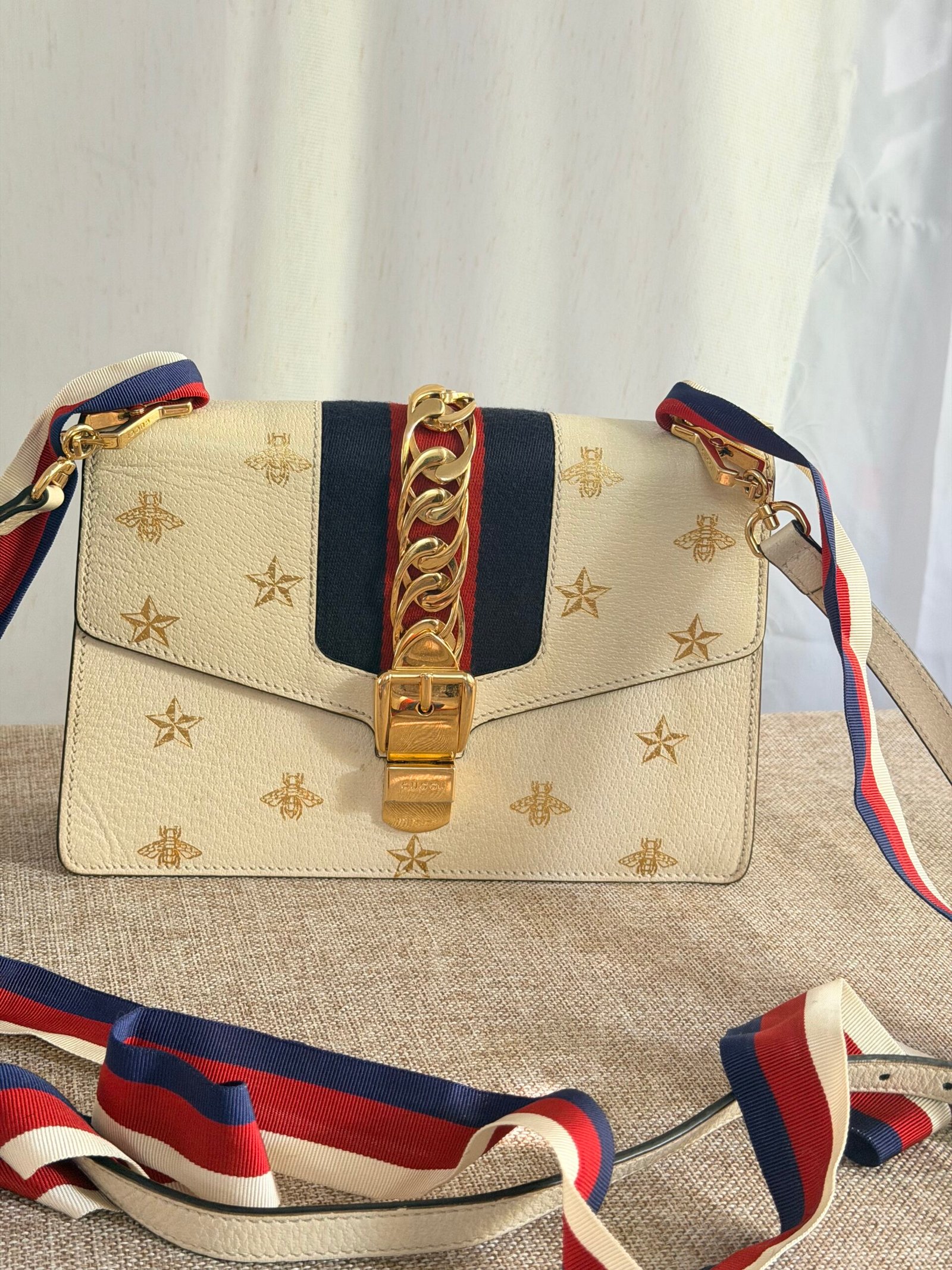 Cream leather with gold bee/star embossing, navy-red webbing + gold chain detail, Gucci metal buckle, red-white-blue webbing adjustable strap (wear as crossbody/shoulder bag; fits phone + small essentials).