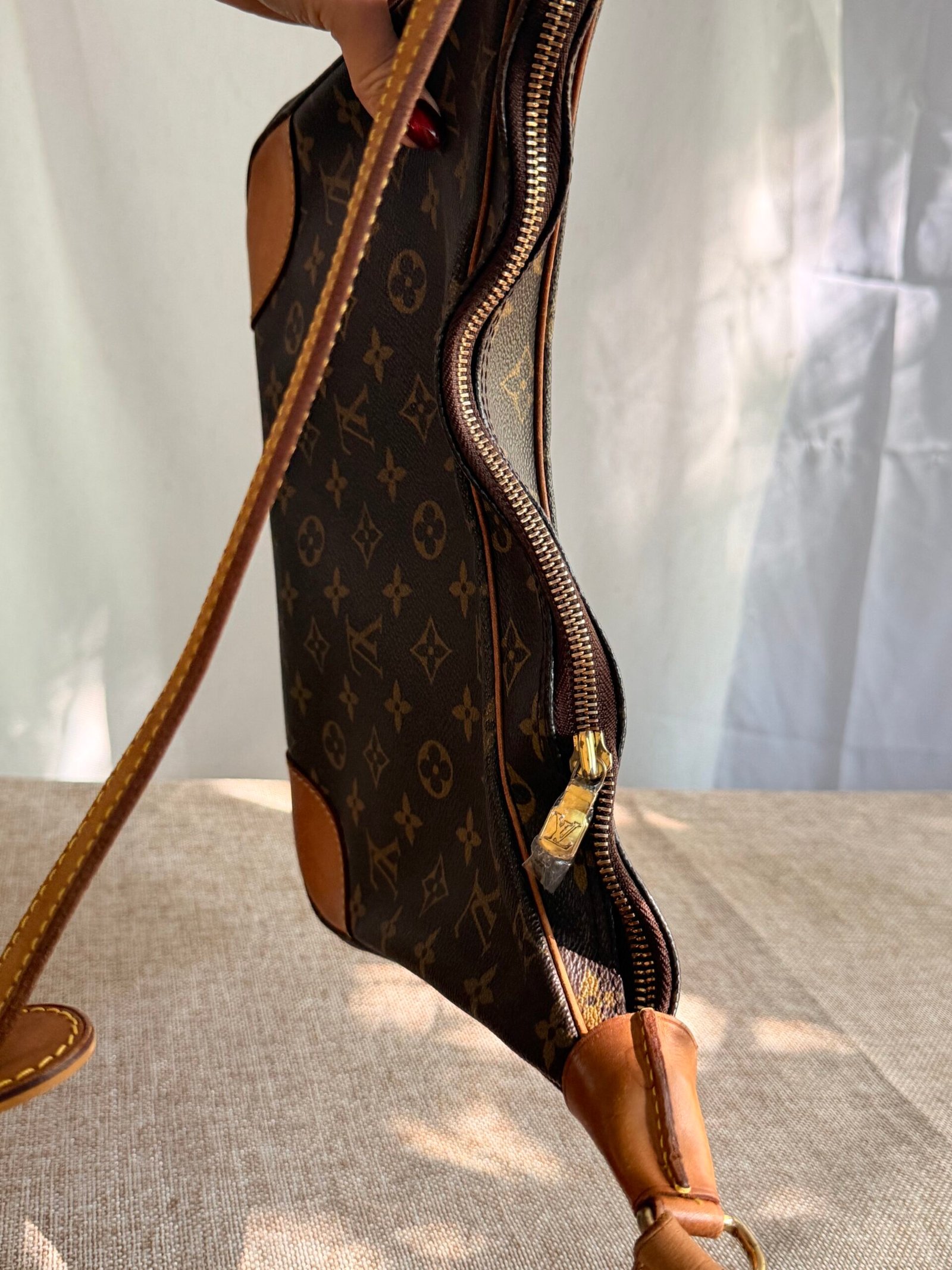 Monogram canvas + leather trim, zip closure, adjustable leather strap (wear as crossbody/shoulder bag; fits phone + daily essentials).