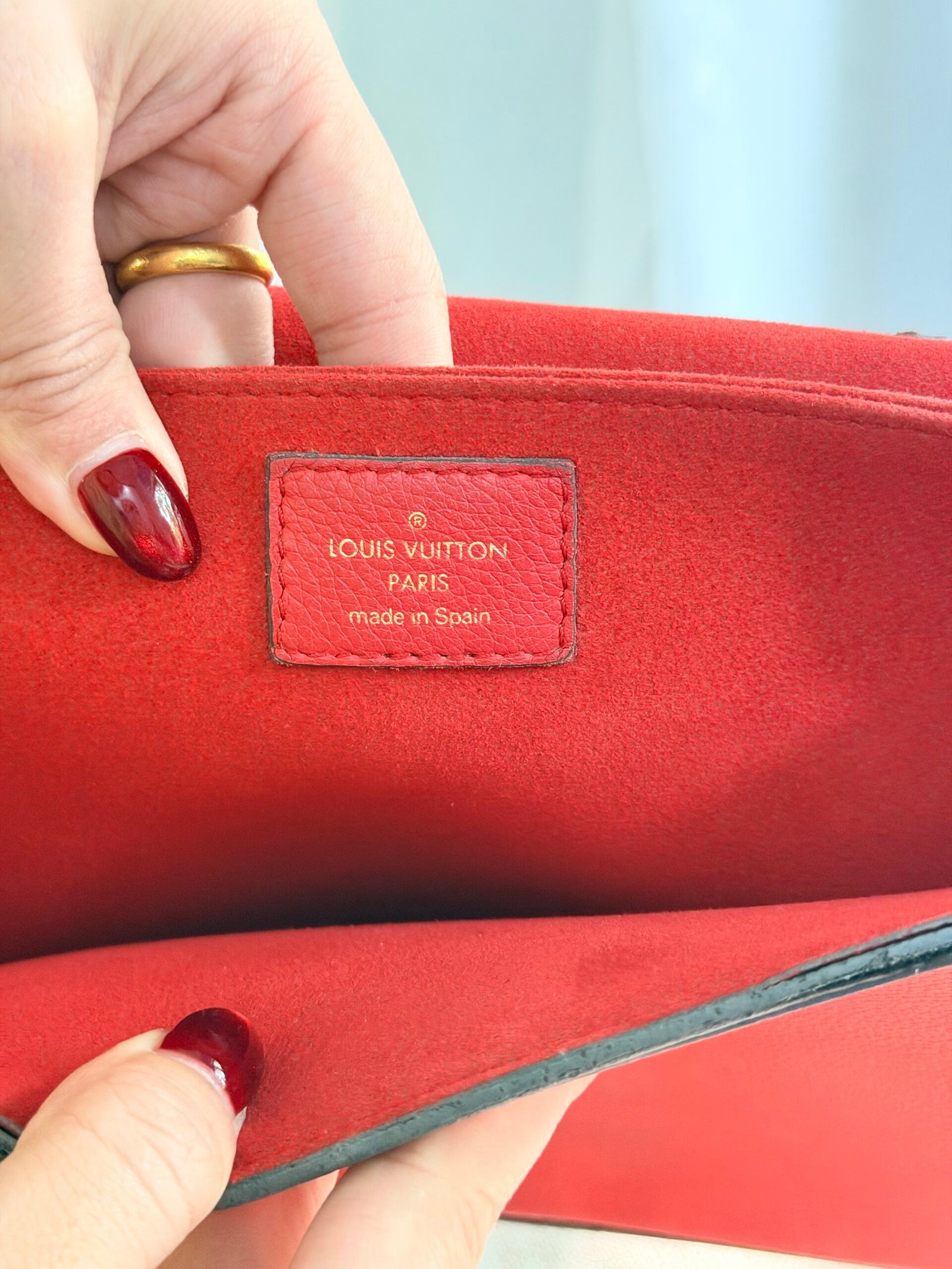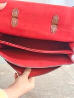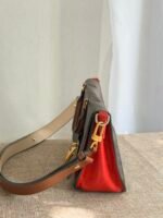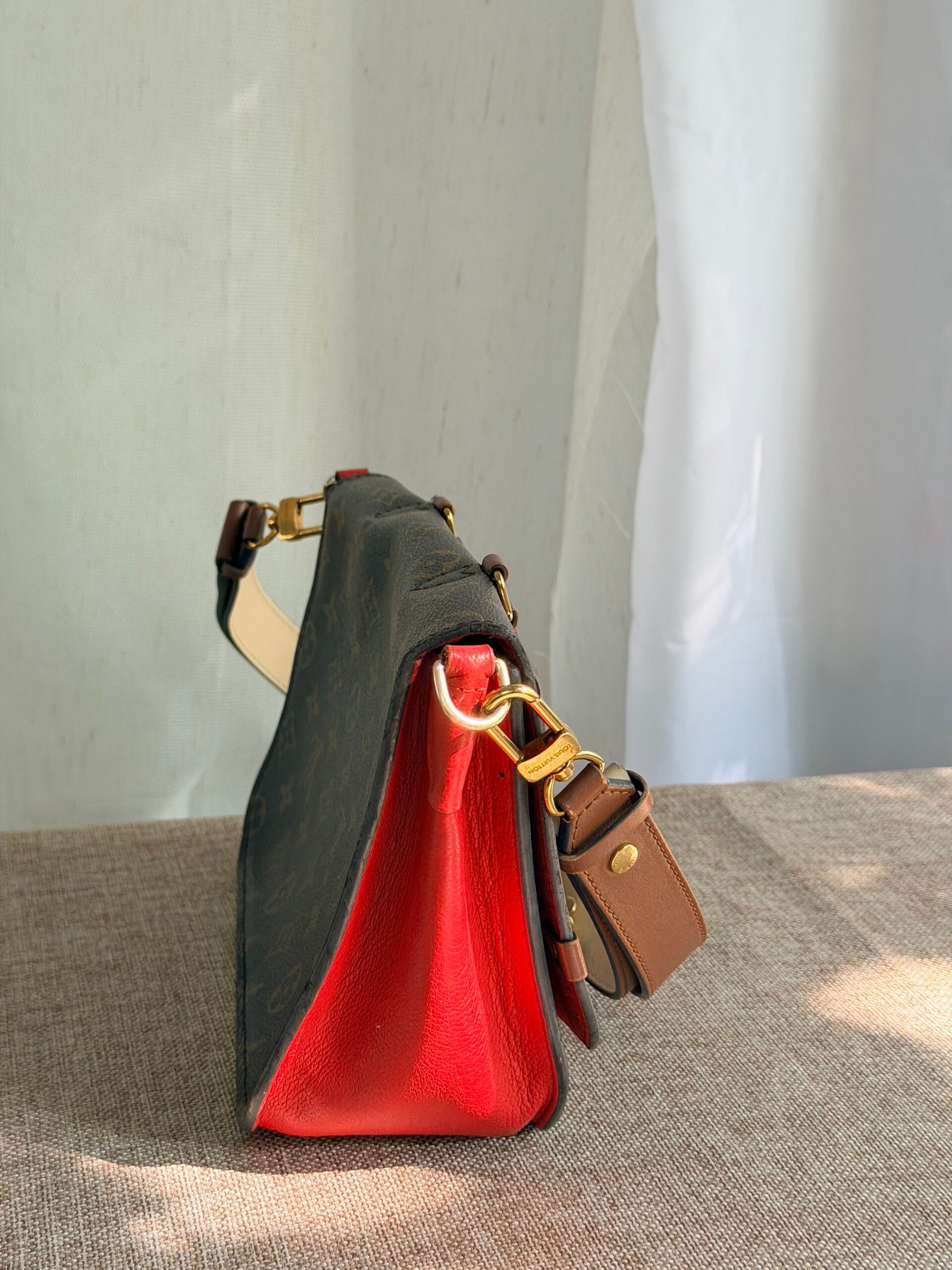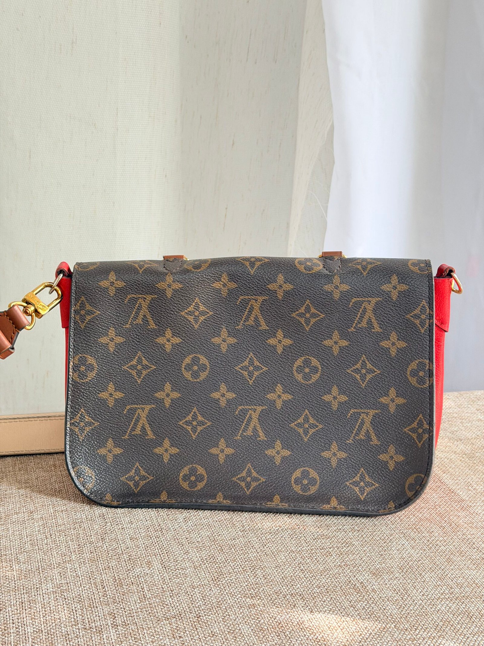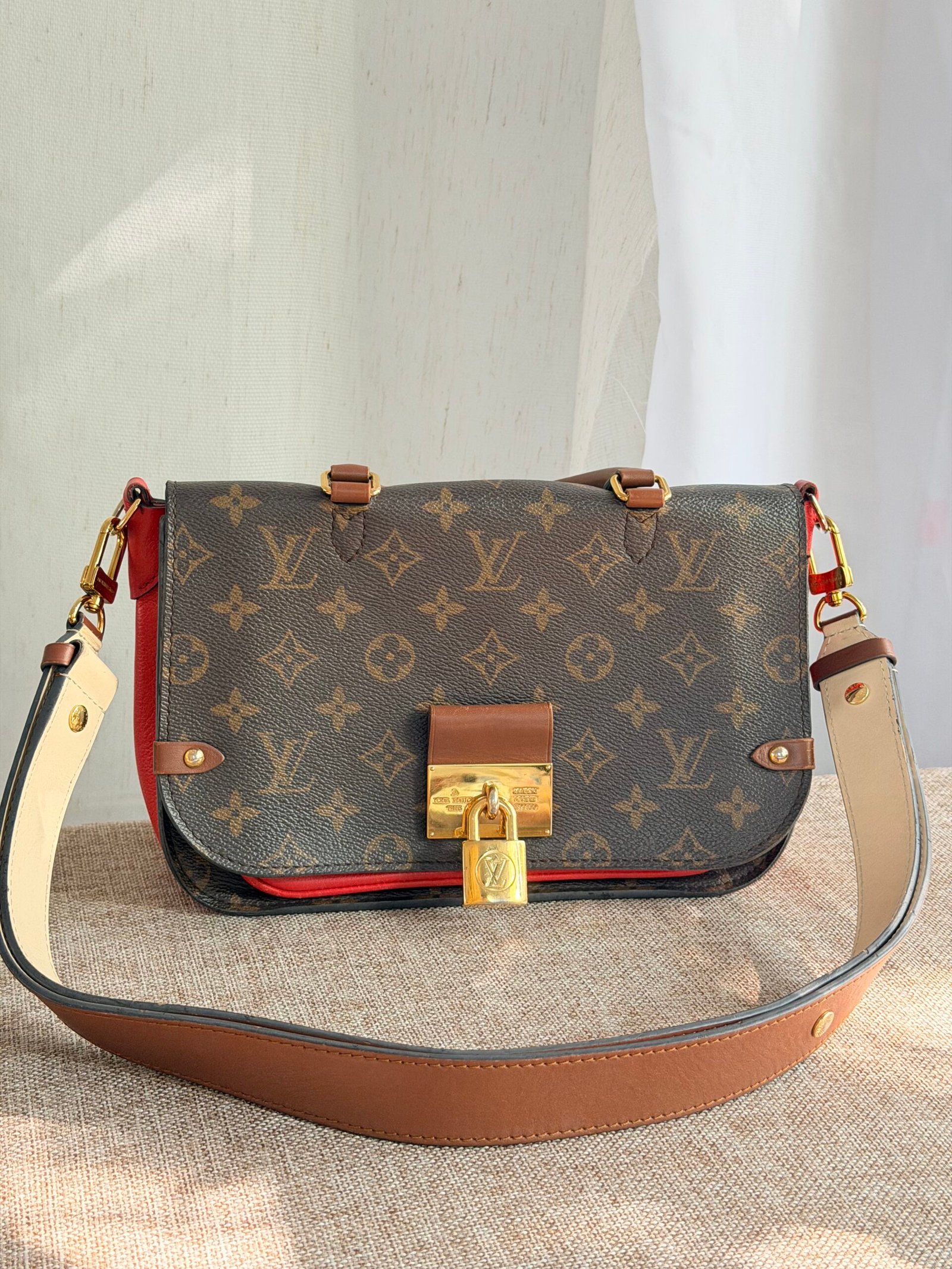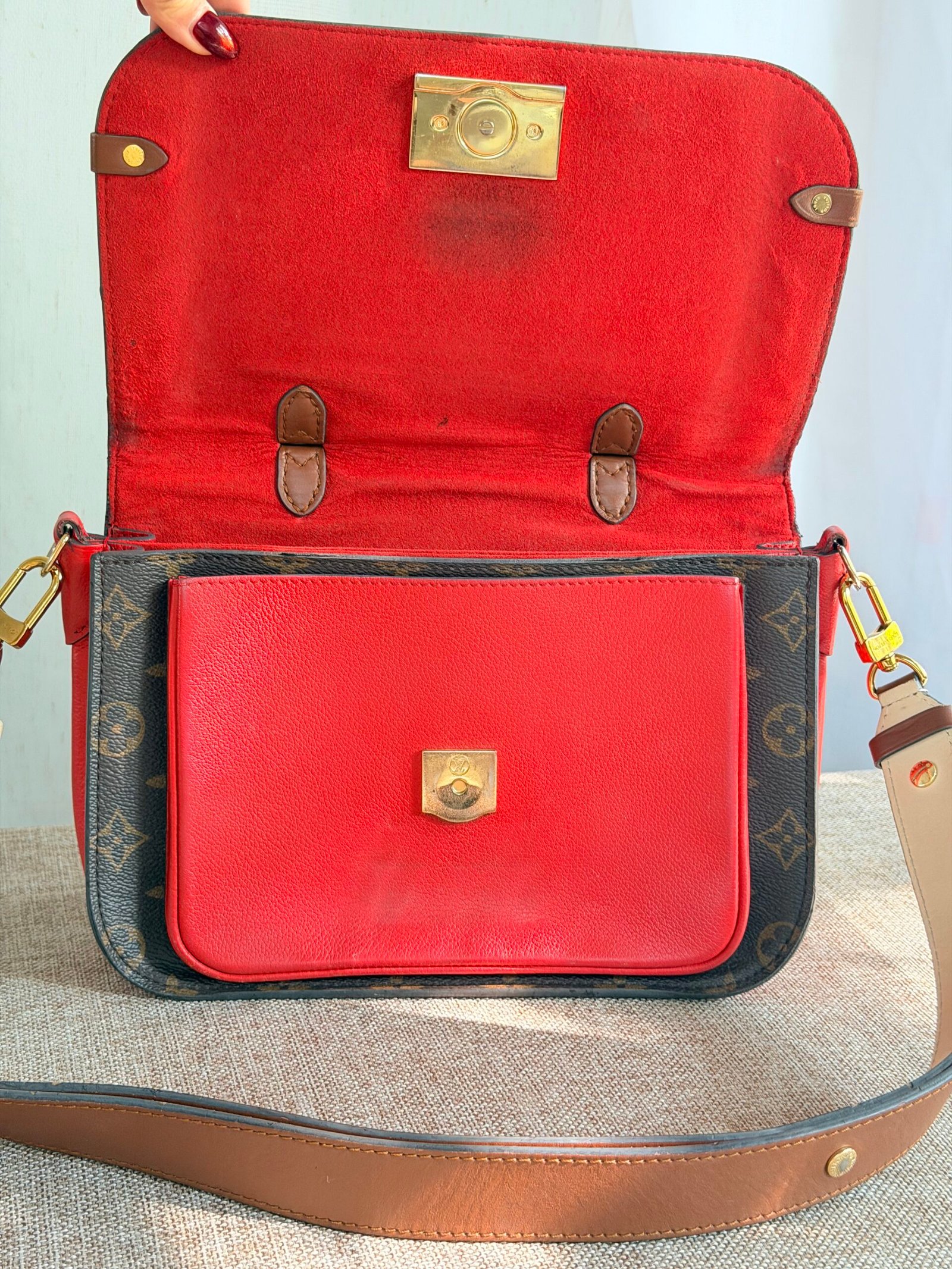 Monogram canvas + leather trim, red contrast lining, gold-tone lock clasp, adjustable multi-tone leather strap (wear as crossbody/shoulder bag; fits phone + daily essentials).