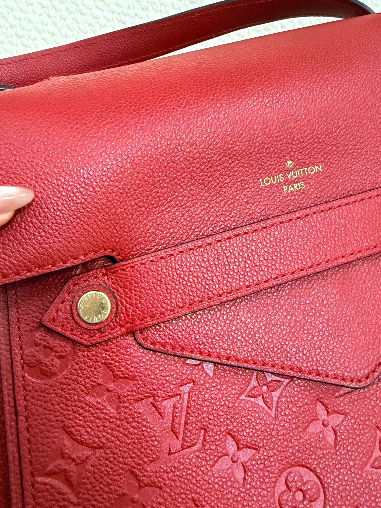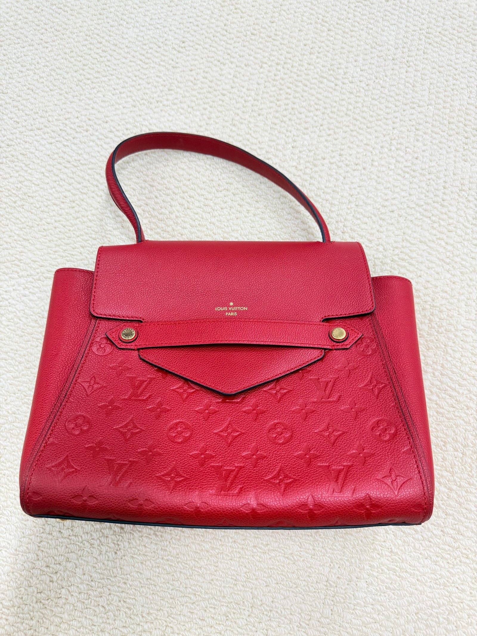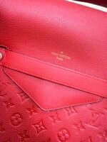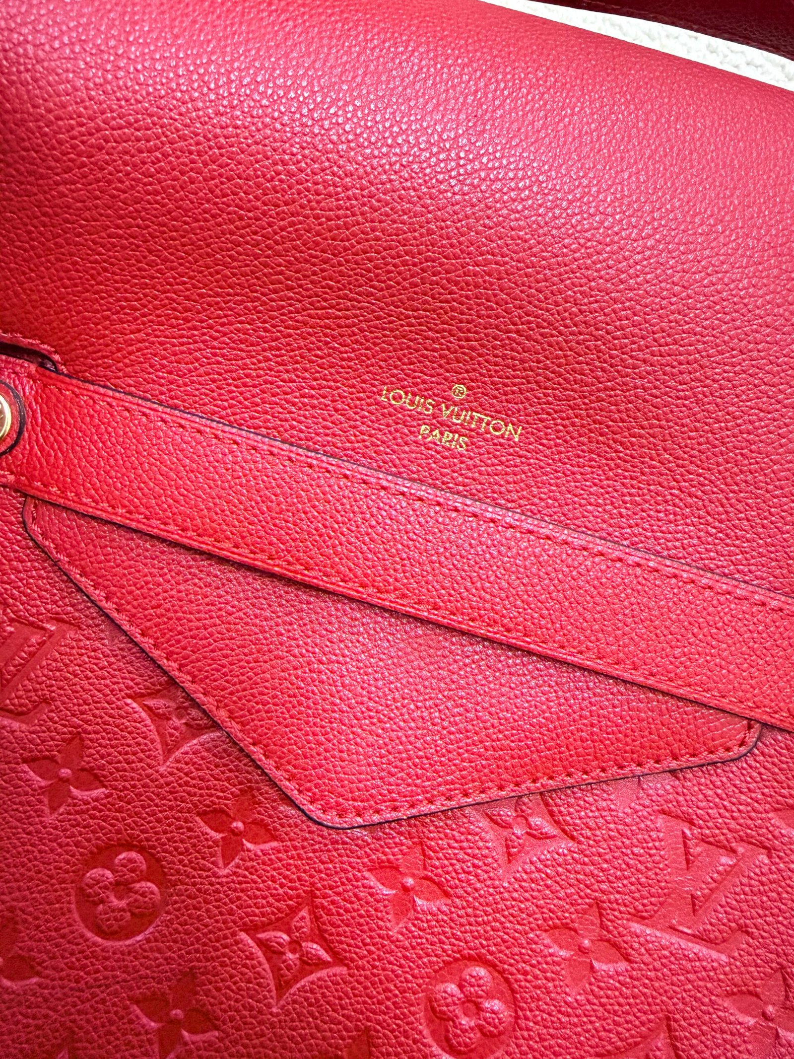 Crafted from supple Monogram Empreinte embossed calfskin leather in vibrant cherry red, this iconic Vavin PM bag features a sleek flap closure with the “Louis Vuitton Paris” gold-tone logo stamp, paired with a flat leather shoulder strap for comfortable everyday wear. The spacious interior includes a slip pocket and a zippered pocket, providing ample storage for your daily essentials, blending the brand’s heritage monogram texture with a modern, structured silhouette.