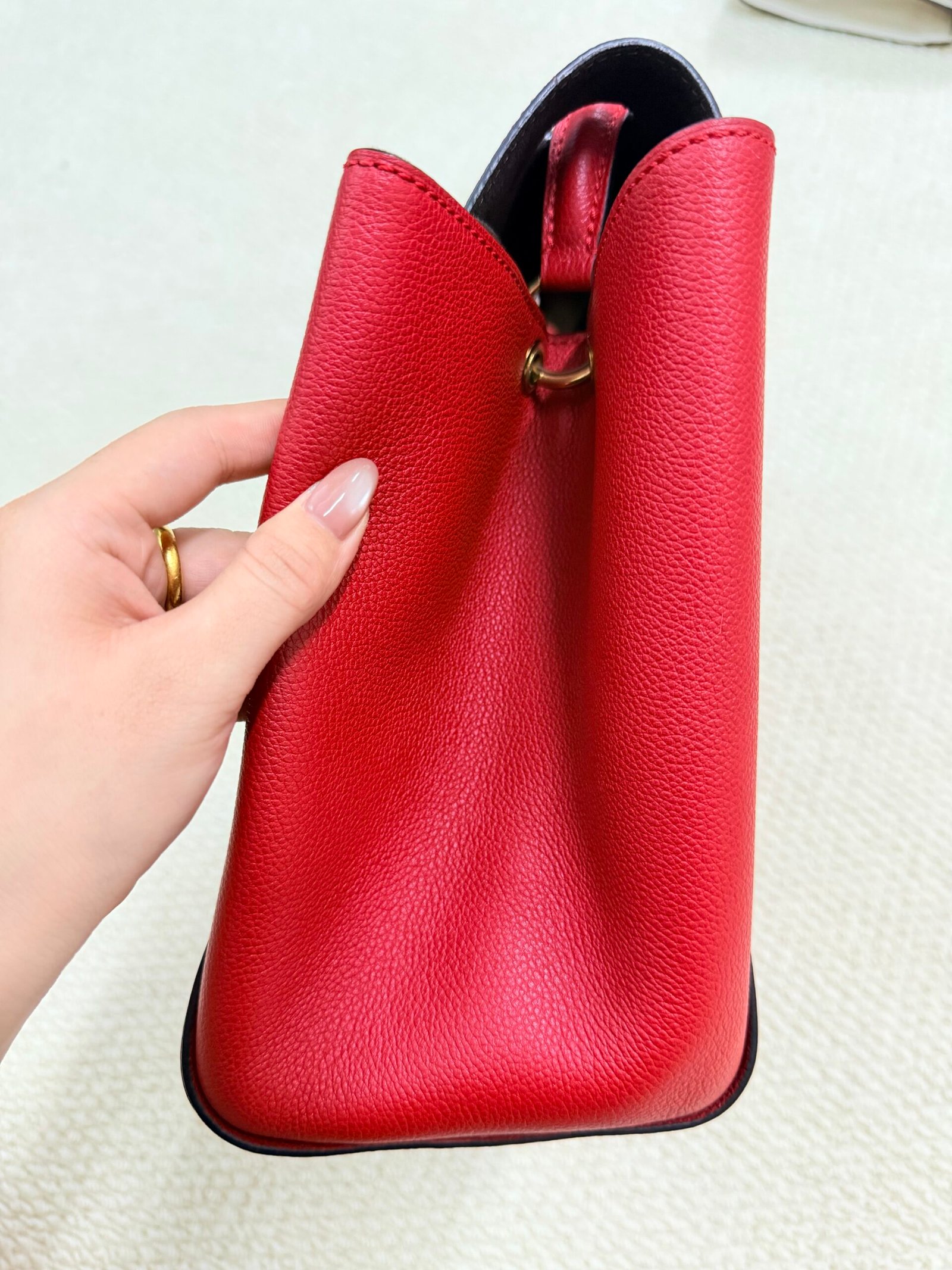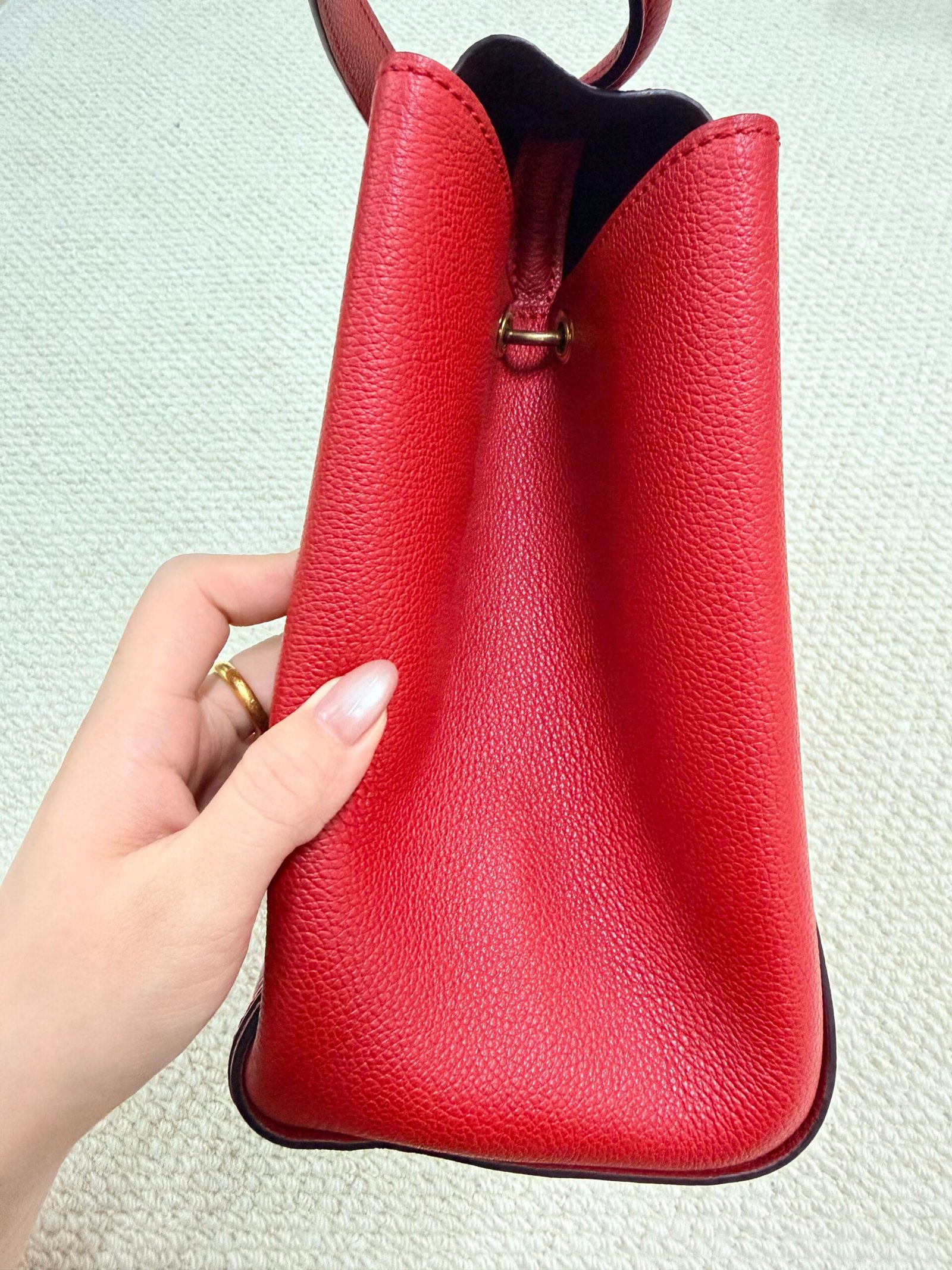 Great pre-owned condition — minor light wear on the hardware and leather edges, with the embossed monogram intact and the rich red color still vibrant.