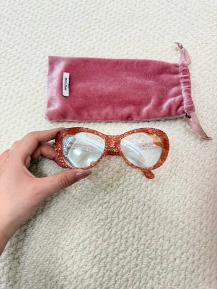 Miu Miu Glitter Cat-Eye Frame Decorative Eyeglasses 100% fully authenticated. Crafted with glitter-embellished acetate material for the orange-pink cat-eye frame,